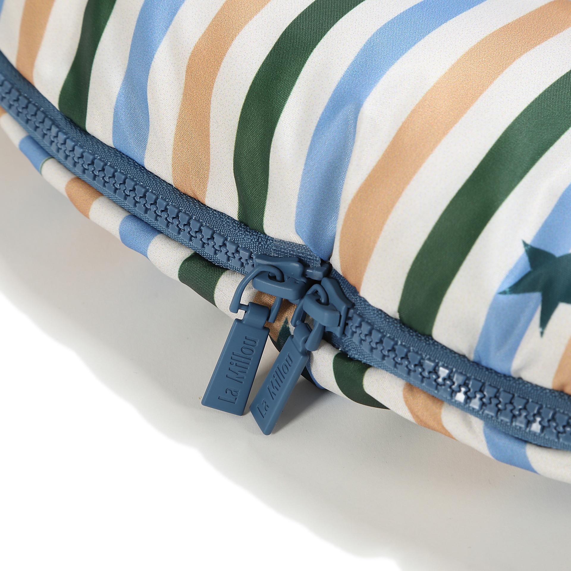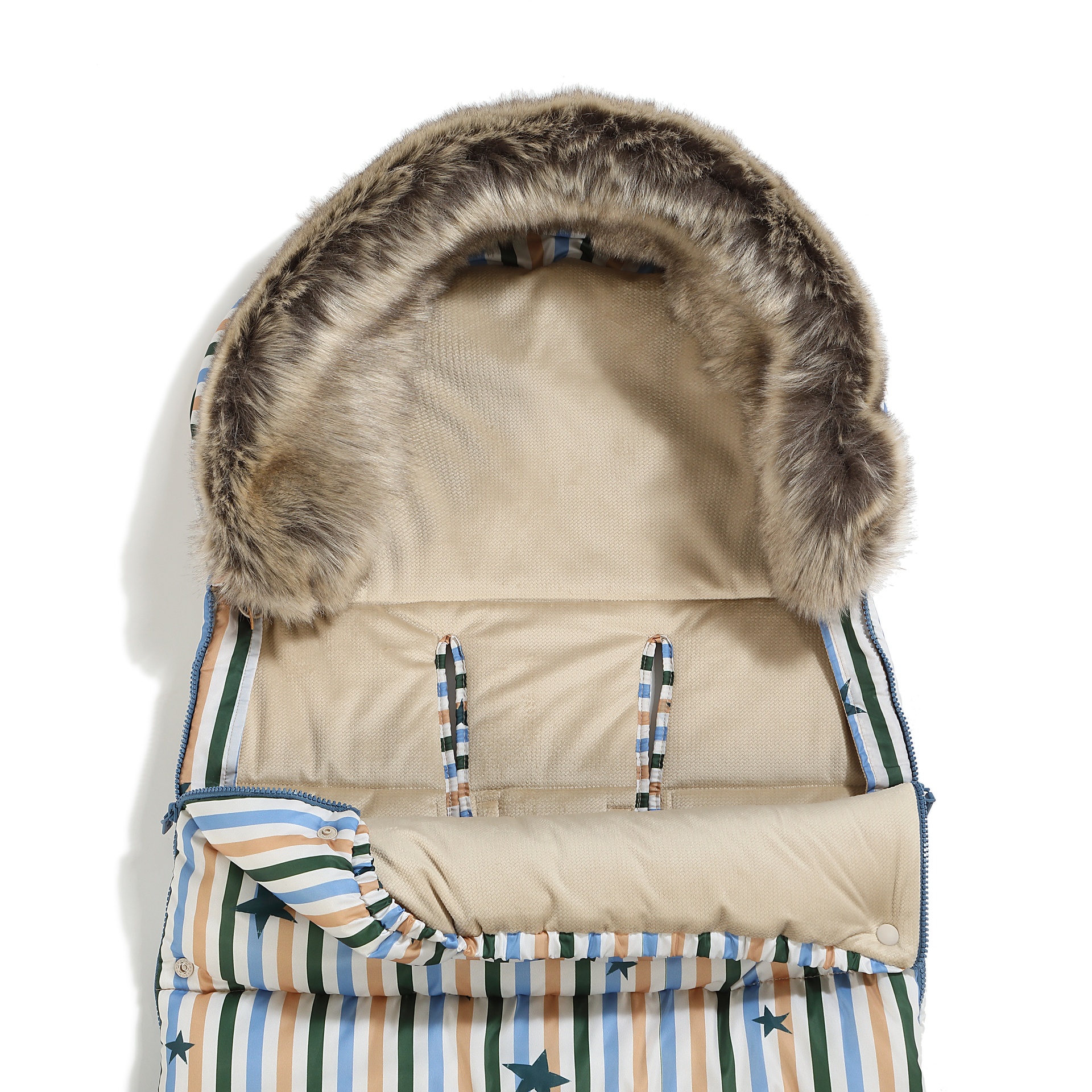 Miegmaišio šonai turi aukštos kokybės užtrauktukus su patogiomis gumytėmis. Užtrauktukai atidaromi iš viršaus ir apačios, todėl galima reguliuoti ventiliaciją arba visiškai nuimti dangą, sukuriant šiltą ir minkštą įdėklą vežimėliui. Šonų atitraukimas leidžia miegmaišį patogiai išplėsti ir pritvirtinti su spaustukais. Nugaros pusėje esantys angos tinka 5 taškų saugos sistemai daugumoje vežimėlių. Papildomas audinio sluoksnis ant gobtuvo nugaros užtikrina, kad miegmaišis nepaslystų vežimėlio nugarėlėje.