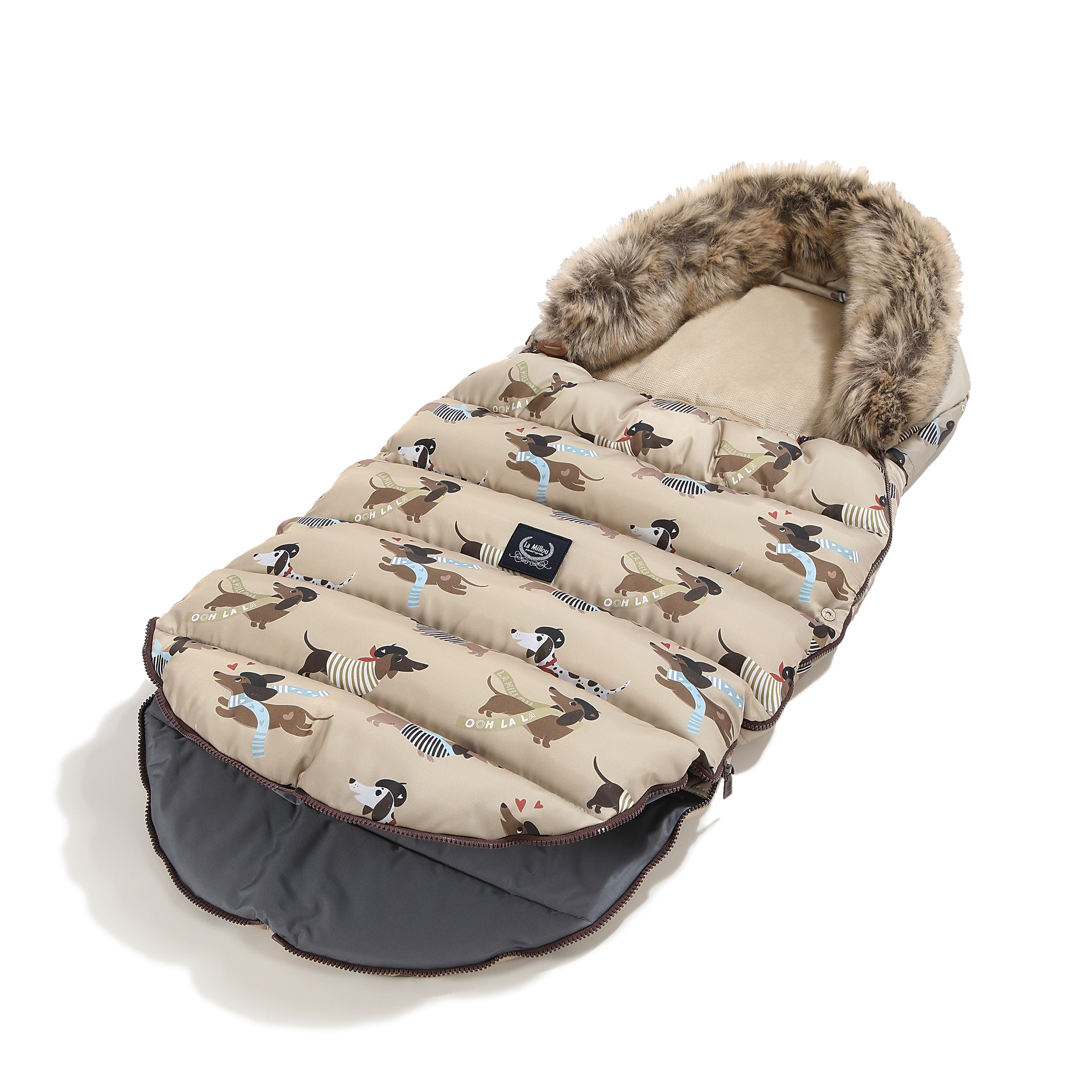 Galvą saugo šilta gobtuvo dalis, papuošta stilingu netikru kailiu, kurį galima nuimti pagal poreikį. Gobtuvas turi siūtas raišteles, leidžiančias reguliuoti dydį pagal vaiko galvą. Viršutinėje dalyje naudojamas pūkuotas, antialerginis užpildas, kuris suteikia papildomą šilumą ir komfortą. Apatinė miegmaišio dalis padengta matiniu poliuretano audiniu, kuris leidžia lengvai nuvalyti nešvarumus.