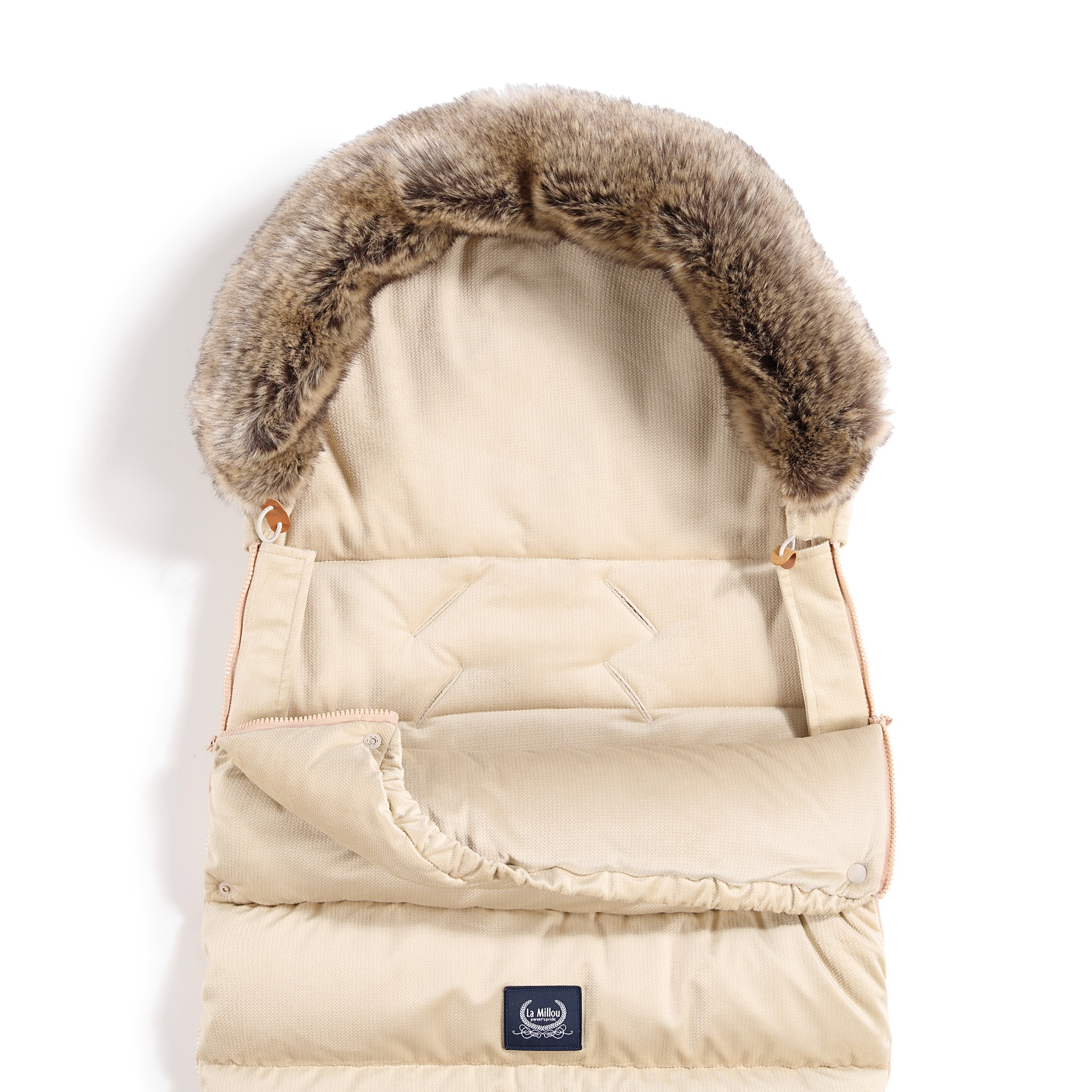 Galvą saugo šilta gobtuvo dalis, papuošta stilingu netikru kailiu, kurį galima nuimti pagal poreikį. Gobtuvas turi siūtas raišteles, leidžiančias reguliuoti dydį pagal vaiko galvą. Viršutinėje dalyje naudojamas pūkuotas, antialerginis užpildas, kuris suteikia papildomą šilumą ir komfortą. Apatinė miegmaišio dalis padengta matiniu poliuretano audiniu, kuris leidžia lengvai nuvalyti nešvarumus.