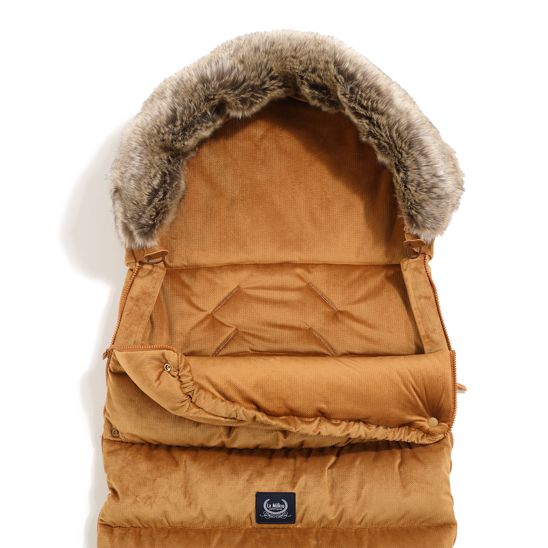 Galvą saugo šilta gobtuvo dalis, papuošta stilingu netikru kailiu, kurį galima nuimti pagal poreikį. Gobtuvas turi siūtas raišteles, leidžiančias reguliuoti dydį pagal vaiko galvą. Viršutinėje dalyje naudojamas pūkuotas, antialerginis užpildas, kuris suteikia papildomą šilumą ir komfortą. Apatinė miegmaišio dalis padengta matiniu poliuretano audiniu, kuris leidžia lengvai nuvalyti nešvarumus.