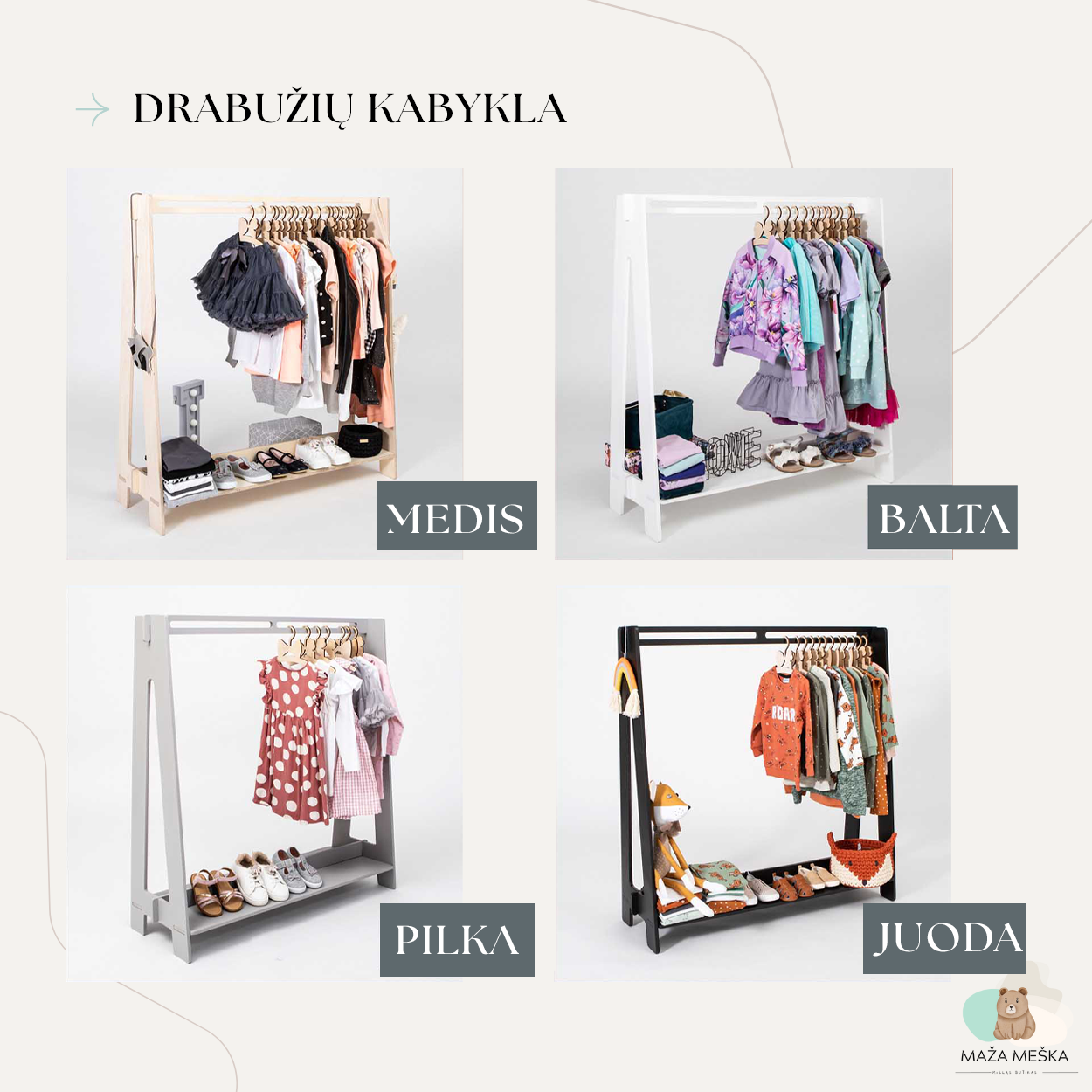 Ši kabykla – puiki mokymo priemonė, padedanti mažiesiems nuo ankstyvo amžiaus mokytis savarankiškumo įgūdžių. A formos rėmas užtikrina stabilumą, o minimalistinis dizainas leidžia lengvai įsilieti į bet kokį interjerą. Kabyklos dizainas leidžia vaikams patiems pasiekti savo drabužius ir džiaugtis tvarkinga, lengvai prieinama rūbų saugykla. Kabyklos apačioje esanti lentynėlė yra puiki vieta laikyti batukų poras, žaislus ar mėgstamas knygeles. Vaikams tikrai patiks turėti savo vietą visiems smulkiems lobiams.