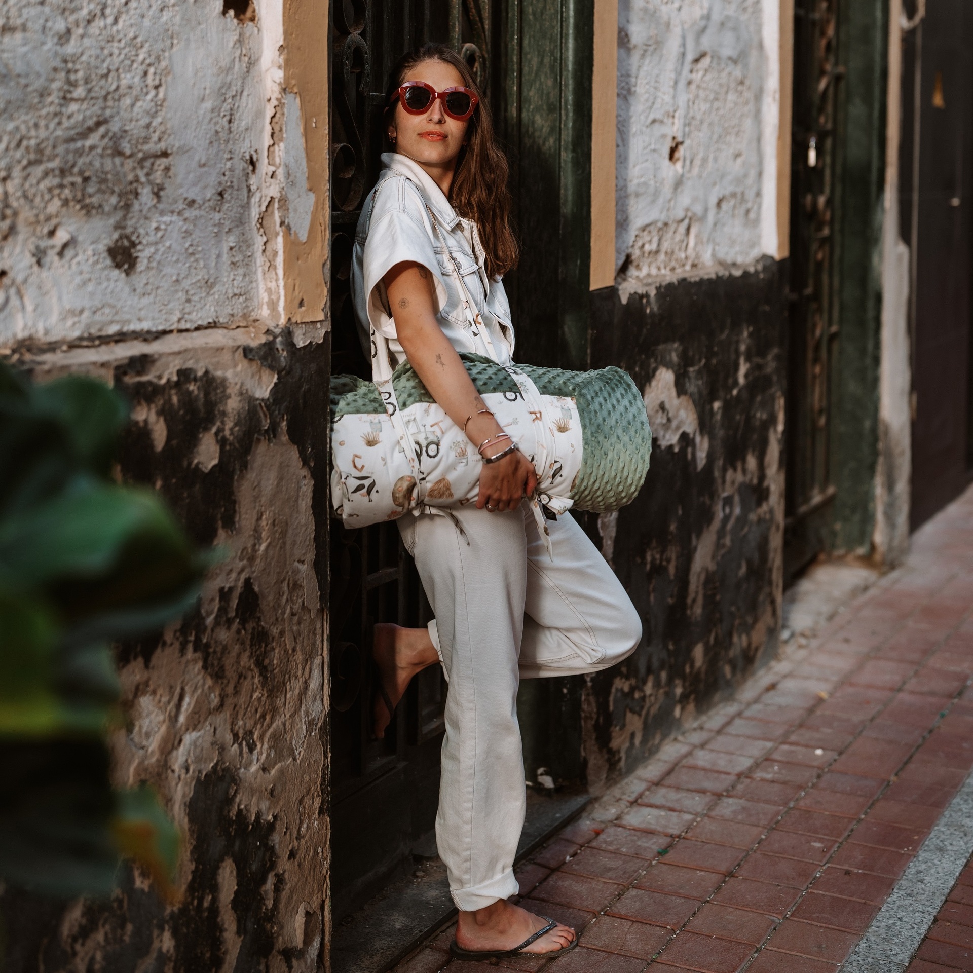 Į antklodės dizainą įtrauktos praktiškos detalės: viena pusė turi siūtas juosteles, kurios leidžia patogiai sulankstyti antklodę, o ilga juostelė sukurta nešiojimui rankoje arba ant peties. Dėl šių sprendimų antklodę galima greitai susukti, sutalpinti į kuprinę ar nešiotis kaip patogų aksesuarą. Be to, antklodė turi užtraukiamą kišenę, kuri yra ideali smulkiems daiktams laikyti – raktams, piniginei ar telefonui. Tai suteikia papildomą patogumą ir organizuotumą lauko veiklų metu.