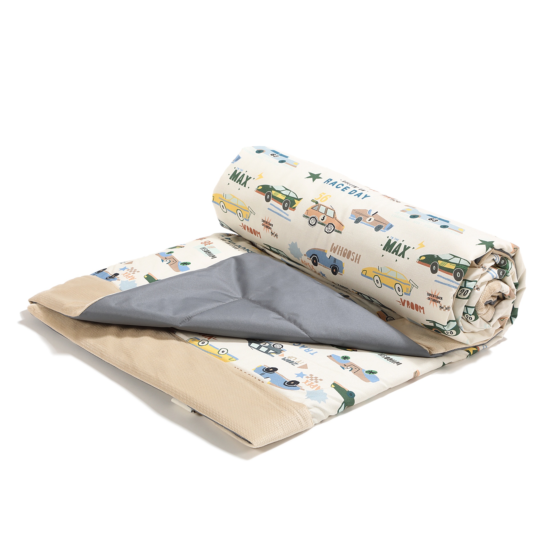Vaikiška Lauko Antklodė Aksominė LENKTYNĖS – tai praktiškas ir patogus sprendimas visoms lauko veikloms su vaikais. Nesvarbu, ar planuojate pikniką gamtoje, žaidimus paplūdimyje, šeimos išvyką ar tiesiog smagiai leisti laiką kieme – ši antklodė taps nepakeičiamu aksesuaru kiekvienai progai. Jos universalus dydis suteikia pakankamai vietos vaikui žaisti arba patogiai atsisėsti su visa šeima.