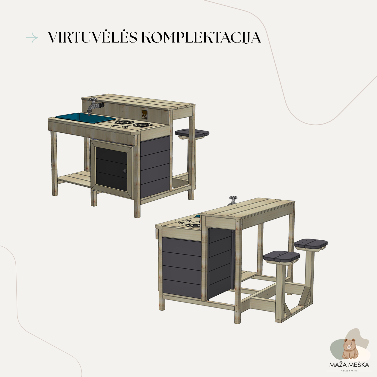 Virtuvėlėje įrengta viryklė su dviem kaitlentėmis, orkaite ir erdviu stalviršiu. Tikra vandens kriauklė su plastikinėmis vonelėmis ir prijungiamu čiaupu leidžia vaikams plauti vaisius, indus ar tiesiog mėgautis vandens žaidimais.