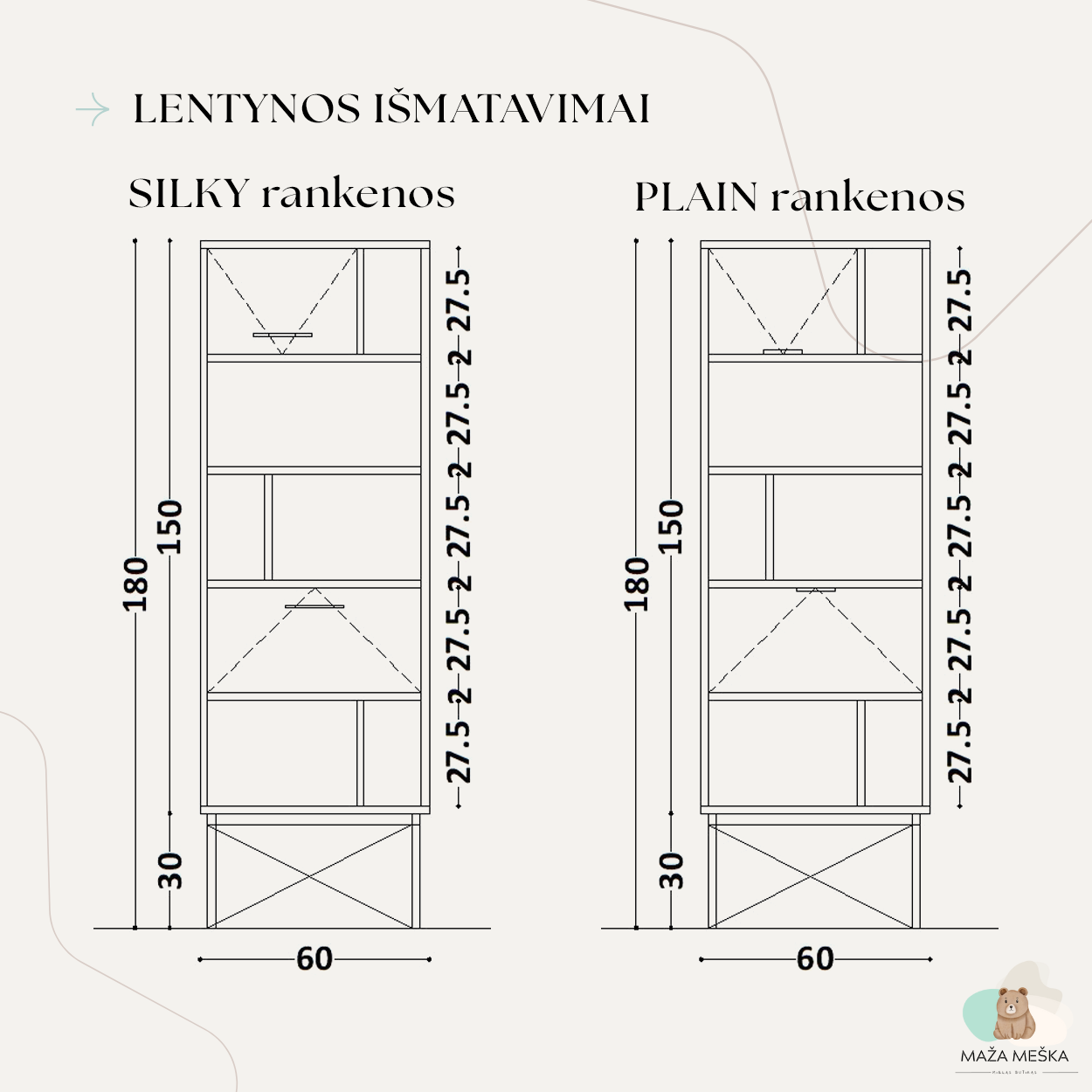 | Lentynos spalva | Black, Brick, Dusty pink, Green, Ice blue, Jungle, Kašmyras, Light grey, Light mustard, Lilly, Medis: ąžuolas, Medis: baltas ąžuolas, Medis: bukas, Medis: riešutas, Mint blue, Oceanic, Pistacija, Plum, Taupe, White |