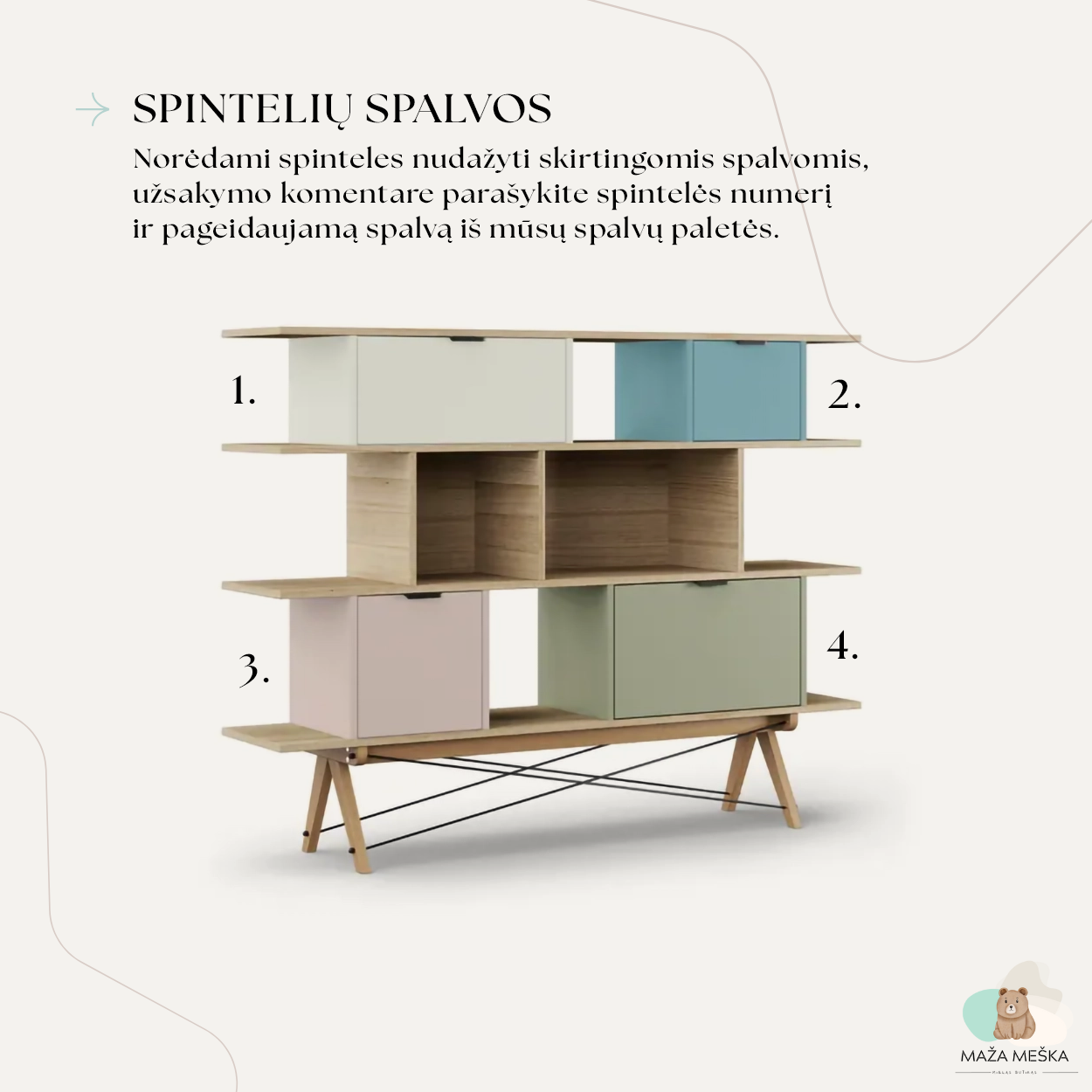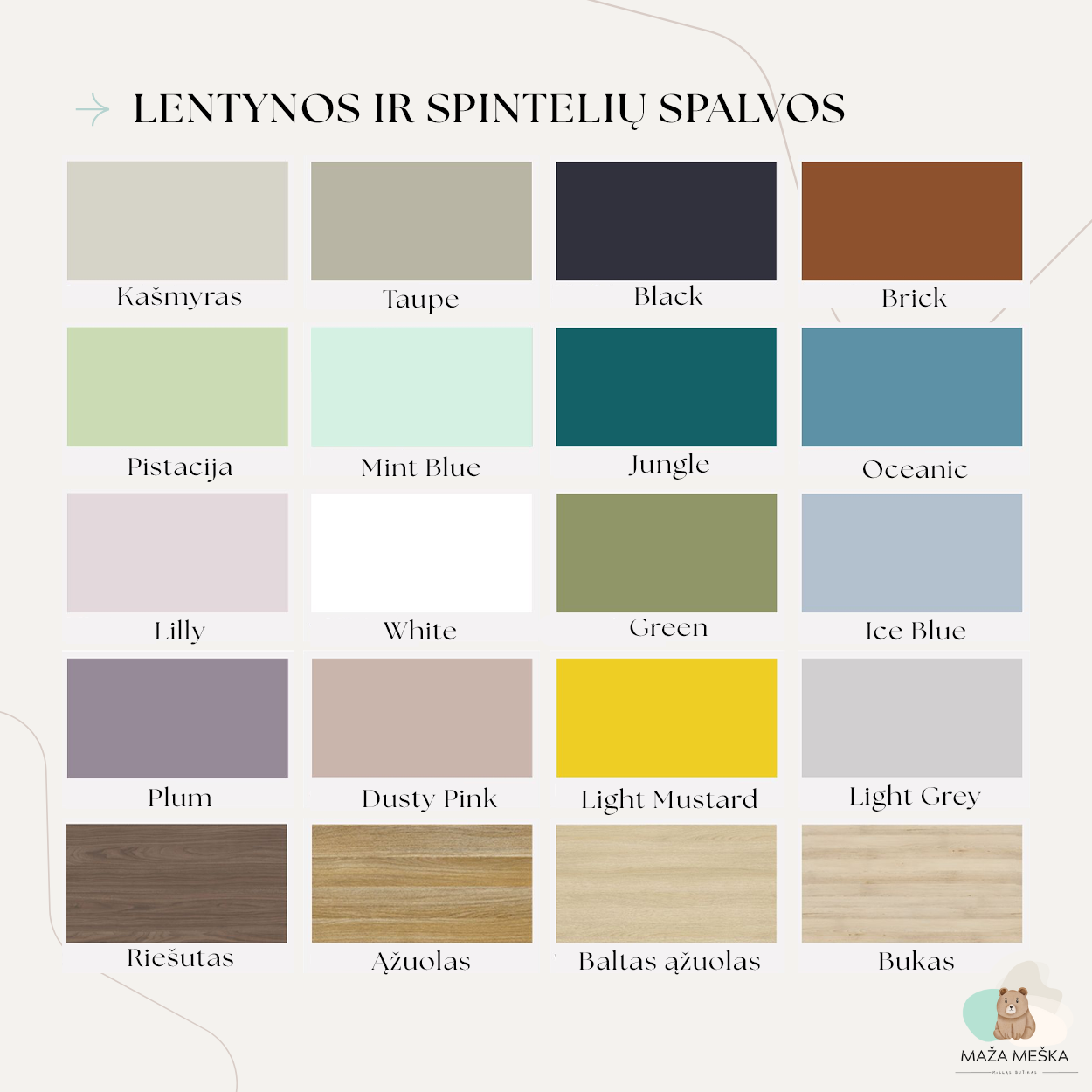 | Lentynos spalva | Black, Brick, Dusty pink, Green, Ice blue, Jungle, Kašmyras, Light grey, Light mustard, Lilly, Medis: ąžuolas, Medis: baltas ąžuolas, Medis: bukas, Medis: riešutas, Mint blue, Oceanic, Pistacija, Plum, Taupe, White |