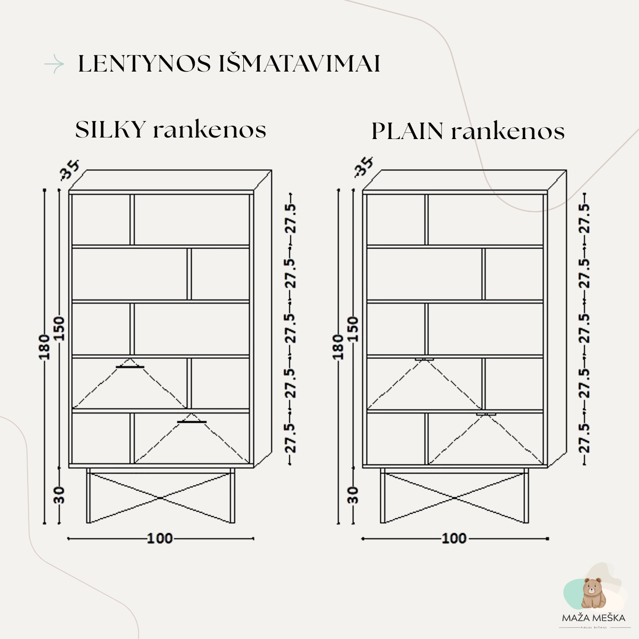 | Lentynos spalva | Black, Brick, Dusty pink, Green, Ice blue, Jungle, Kašmyras, Light grey, Light mustard, Lilly, Medis: ąžuolas, Medis: baltas ąžuolas, Medis: bukas, Medis: riešutas, Mint blue, Oceanic, Pistacija, Plum, Taupe, White |
