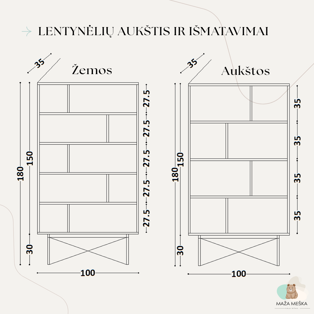 | Lentynėlių aukštis | Aukštos: 4 x 35 cm, Žemos: 5 x 27.5 cm |