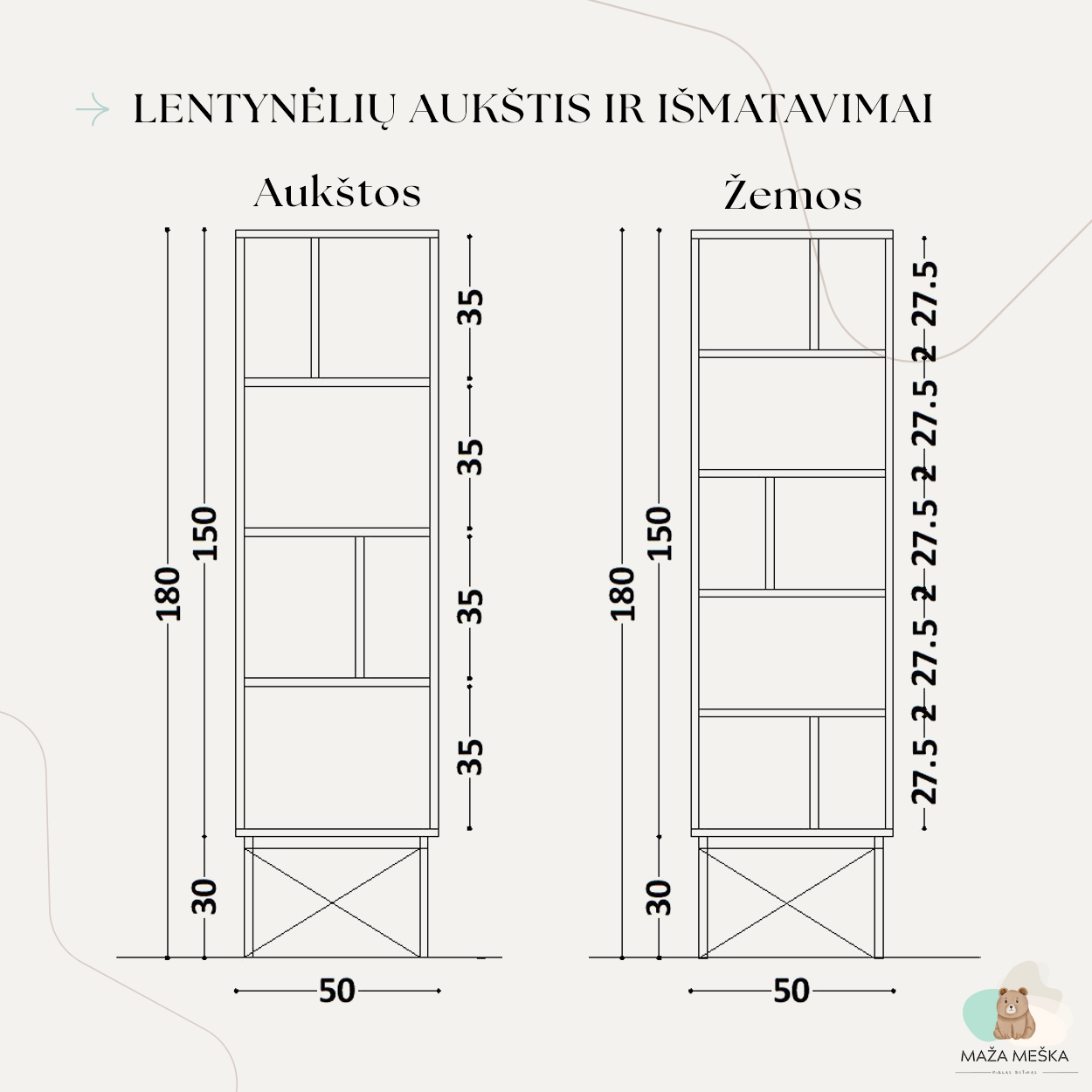 | Lentynėlių aukštis | Aukštos: 4 x 35 cm, Žemos: 5 x 27.5 cm |