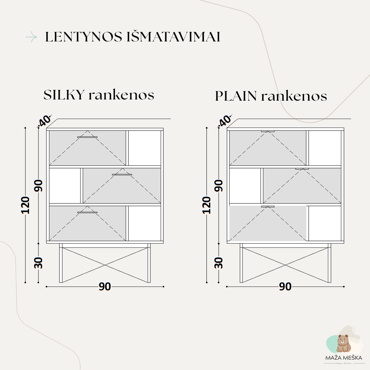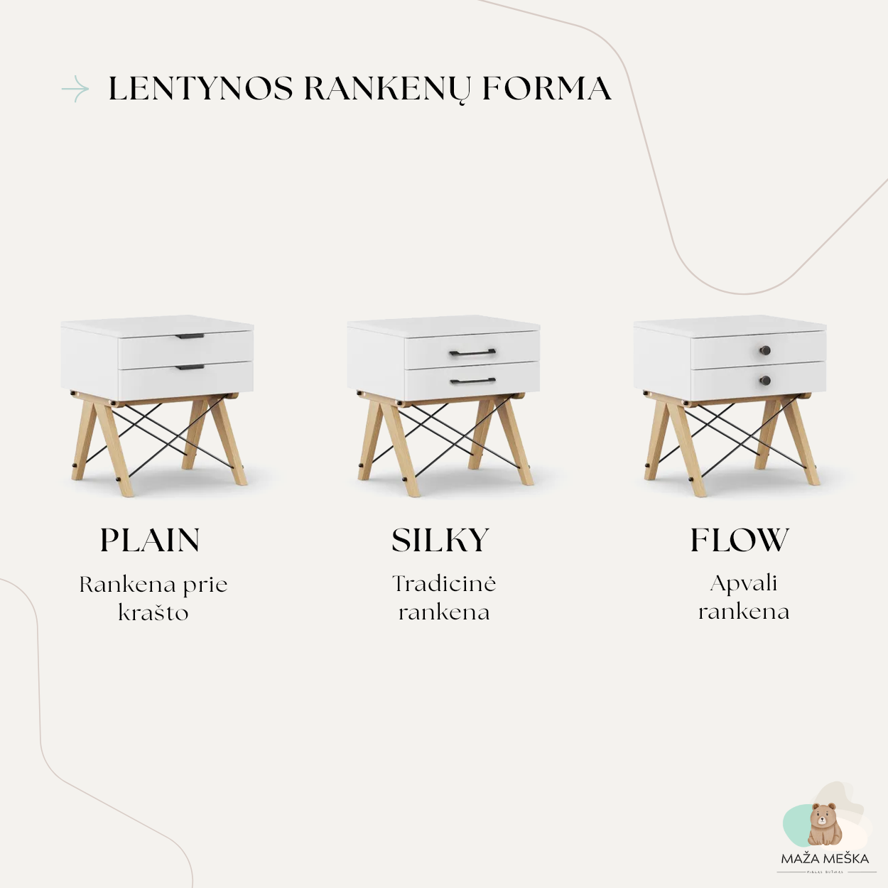 | Lentynos spalva | Black, Brick, Dusty pink, Green, Ice blue, Jungle, Kašmyras, Light grey, Light mustard, Lilly, Medis: ąžuolas, Medis: baltas ąžuolas, Medis: bukas, Medis: riešutas, Mint blue, Oceanic, Pistacija, Plum, Taupe, White |