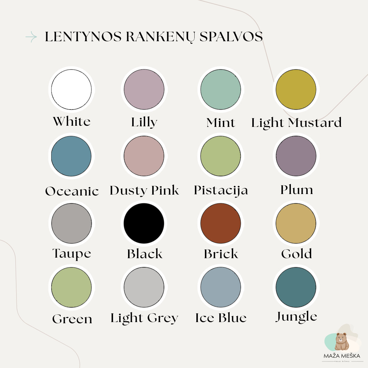 | Rankenų spalva | Black, Brick, Dusty Pink, Gold, Green, Ice Blue, Jungle, Light Grey, Light Mustard, Lilly, Mint, Oceanic, Pistacija, Plum, Taupe, White |