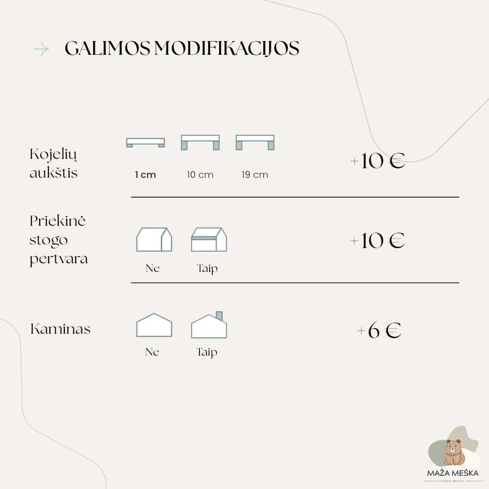 | Spalva | Natūrali mediena, Skaidrus lakas, Balta, Pilka, Melsva, Mėtinė, Rausva, Retro rausva, Kašmyro, Tamsiai žalia, Karamelinė, Tamsus riešutas |