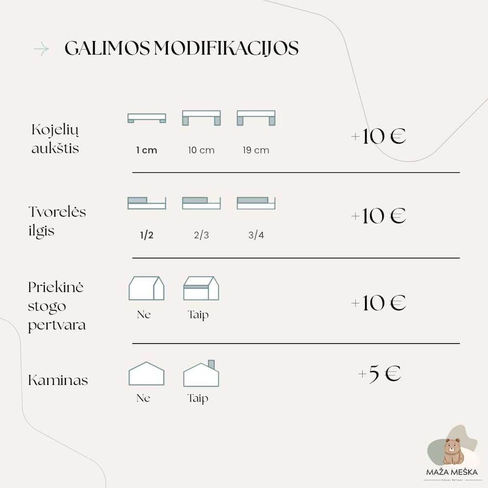 | Spalva | Natūrali mediena, Skaidrus lakas, Balta, Pilka, Melsva, Mėtinė, Rausva, Retro rausva, Kašmyro, Tamsiai žalia, Karamelinė, Tamsus riešutas |