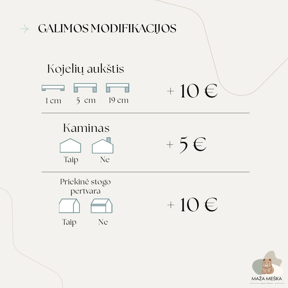 | Spalva | Natūrali mediena, Skaidrus lakas, Balta, Pilka, Melsva, Mėtinė, Rausva, Retro rausva, Kašmyro, Tamsiai žalia, Karamelinė, Tamsus riešutas |