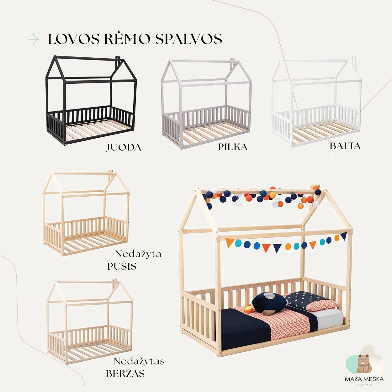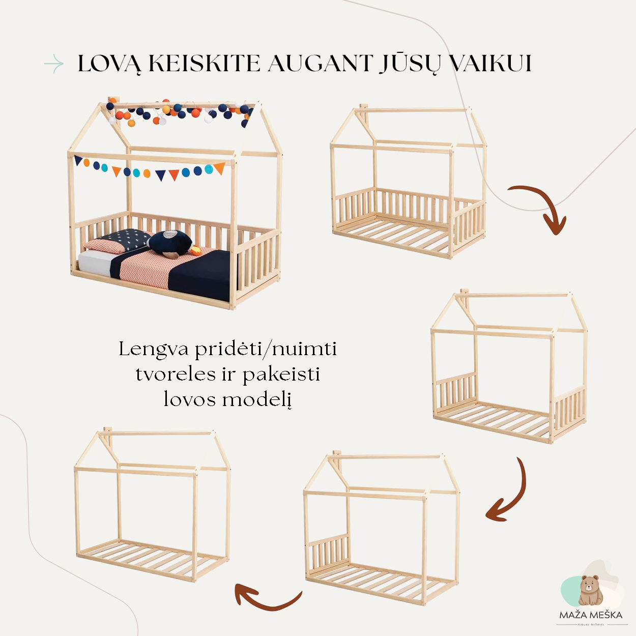 Lova-namelis su apsaugomis ne tik padeda apsaugoti mažylius nuo iškritimo, bet ir suteikia galimybę augant keisti lovos modelį – lengvai pridėkite arba nuimkite šonines apsaugas pagal poreikį. Atvira rėmo konstrukcija leidžia įgyvendinti įvairias dekoravimo idėjas: sukurkite pasakų kampelį su lempučių girlianda ar spalvingomis vėliavėlėmis arba pasirinkite minimalistinį stilių. Ši lova – tai ne tik miego vieta, bet ir erdvė svajonėms, kurioje vaikas gali augti, kurti ir džiaugtis kiekviena akimirka.