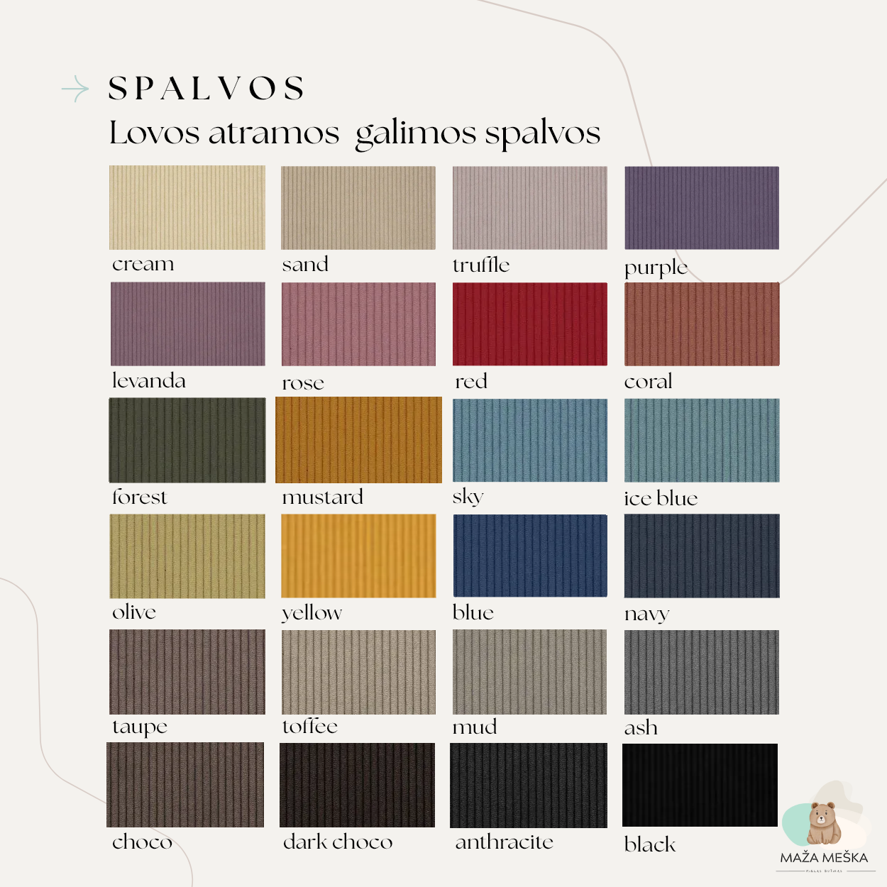 | Žiedlapių spalva | Anthracite, Ash, Black, Blue, Choco, Choco dark, Coral, Cream, Forest, Ice Blue, Levanda, Mud, Mustard, Navy, Olive, Purple, Red, Rose, Sand, Sky, Taupe, Toffee, Truffle, Yellow |