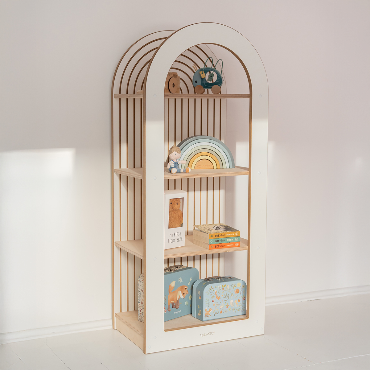 Keturi lentynos lygiai yra pritaikyti vaikų poreikiams, net ir patiems mažiausiems. Apatinė lentyna įrengta itin žemai – vos 6,5 cm nuo grindų – todėl daiktus gali pasiekti net ropojantis vaikas. Tai padeda nuo pat ankstyvo amžiaus mokytis tvarkos, erdvės suvokimo ir savarankiško žaidimo.