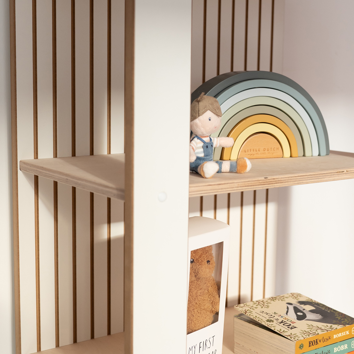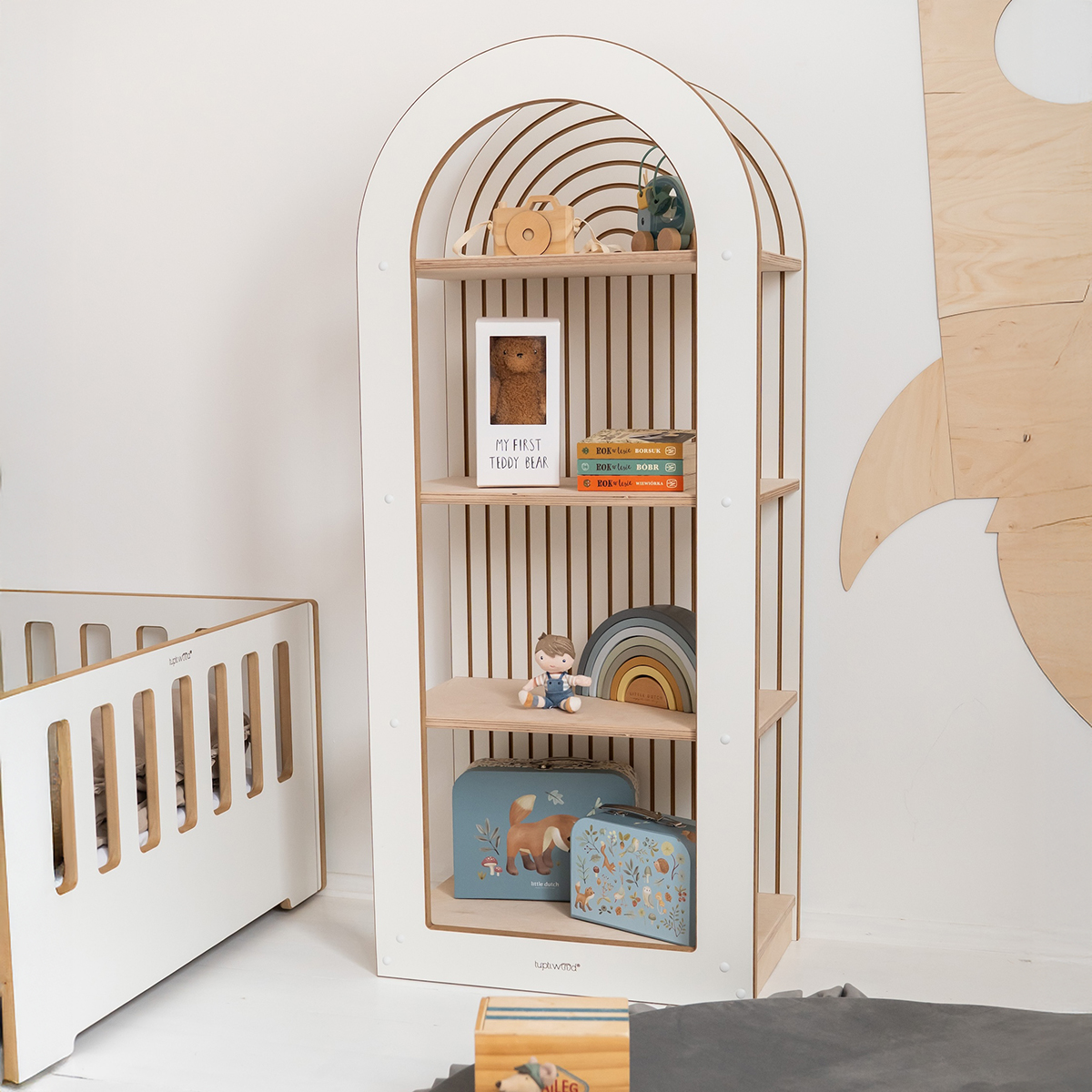 Išskirtinis KIDDY MAXI dizaino akcentas – vaivorykštės formos frezuota nugarėlė. Ji suteikia lentynai žaismingumo ir švelnumo, todėl baldas tampa ne tik praktiškas, bet ir estetiškas vaikų kambario akcentas. Lentyna puikiai dera tiek moderniame, tiek natūraliame, skandinaviškame interjere.