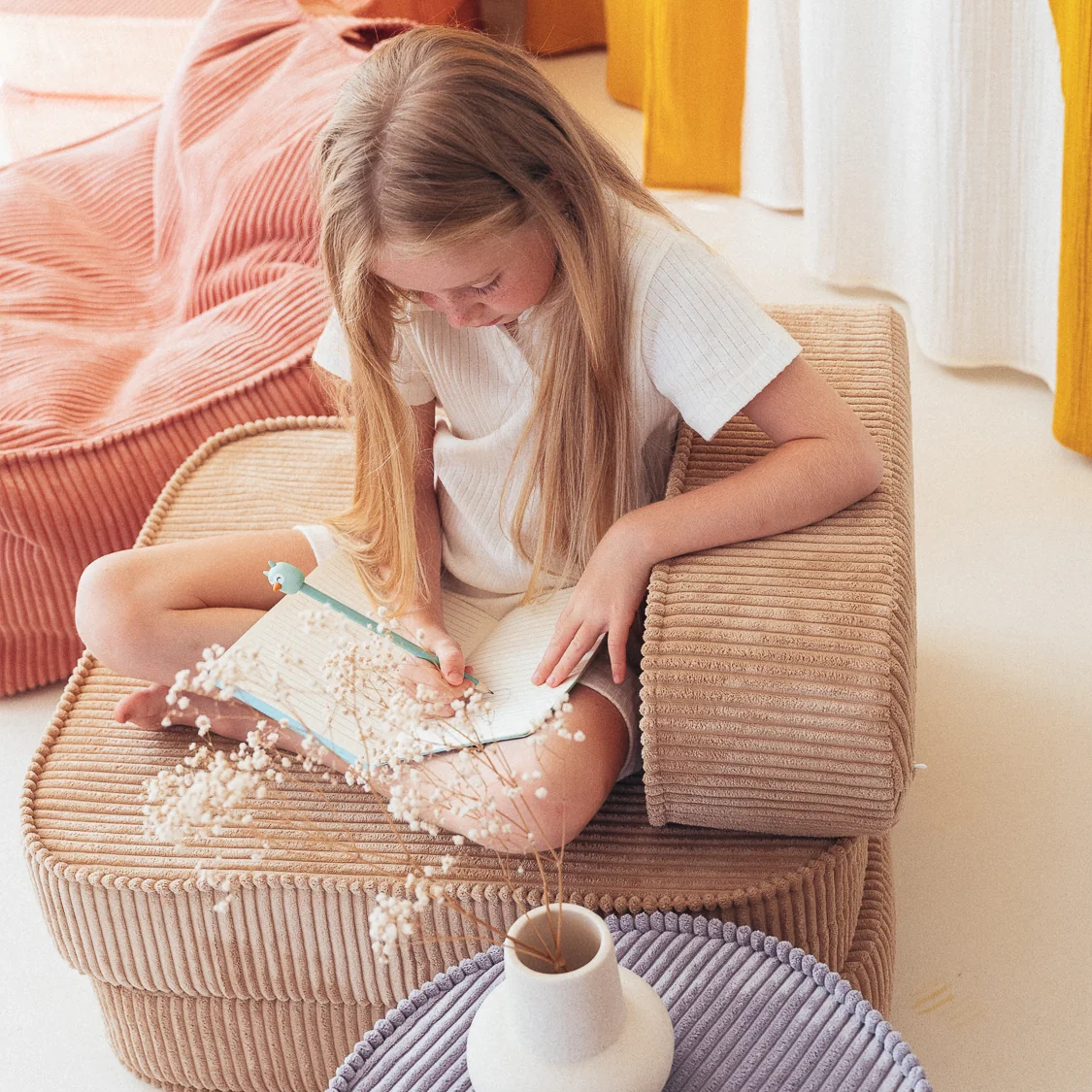 Pagaminta iš OEKO-TEX® ir GRS® sertifikuoto, plačiaraiščio korduro. Minkštos, jaukios medžiagos, pagamintos iš perdirbtų PET butelių. Ši kėdė-gultas yra draugiška ir vaikui, ir gamtai. Viduje – ISO sertifikuotas poliuretano putų užpildas, kuris suteikia reikiamą minkštumą bei atramą.