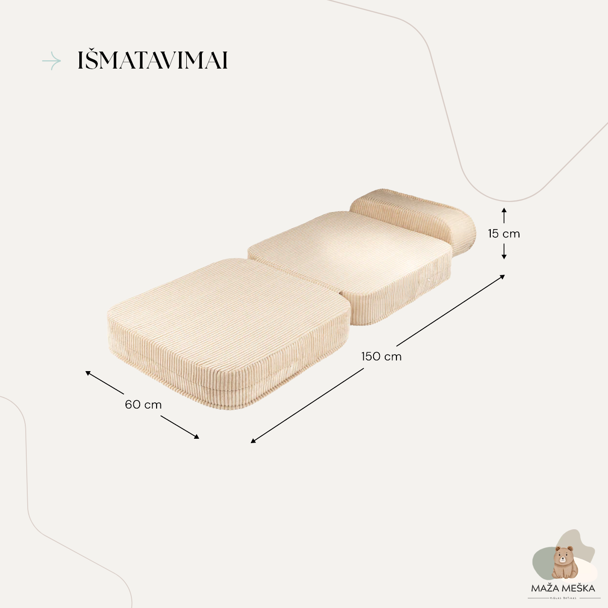 2-in-1 funkcionalumas: dieną – tai patogi kėdė skaitymui, piešimui ar pokalbiams su draugais, o vakare – išskleidžiama į 150 cm ilgio ir 60 cm pločio čiužinį, puikiai tinkantį nakvynėms ar poilsio valandėlėms. Sulankstyta ji užima nedaug vietos (65x60x25 cm), tad kambarys visada išlieka erdvus.