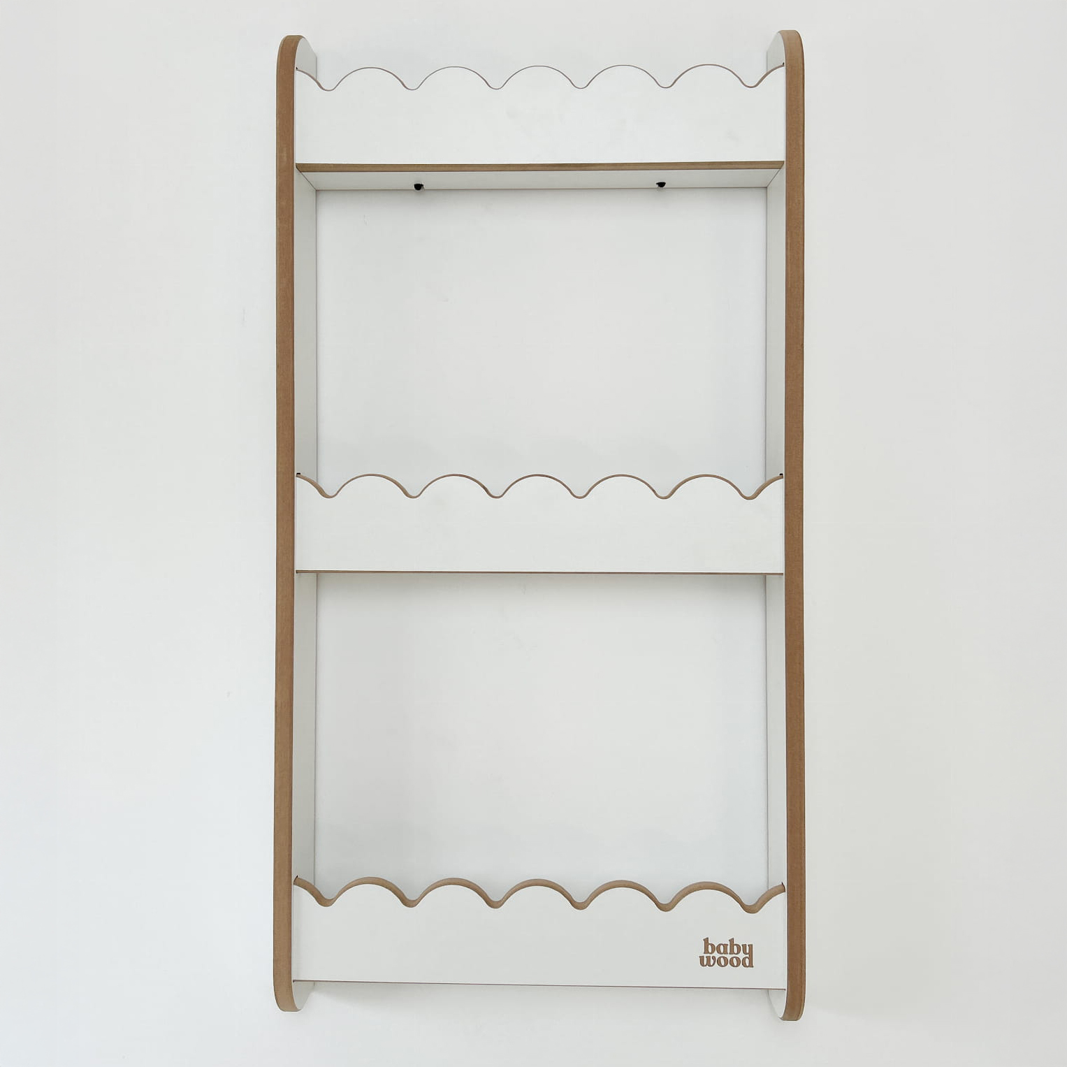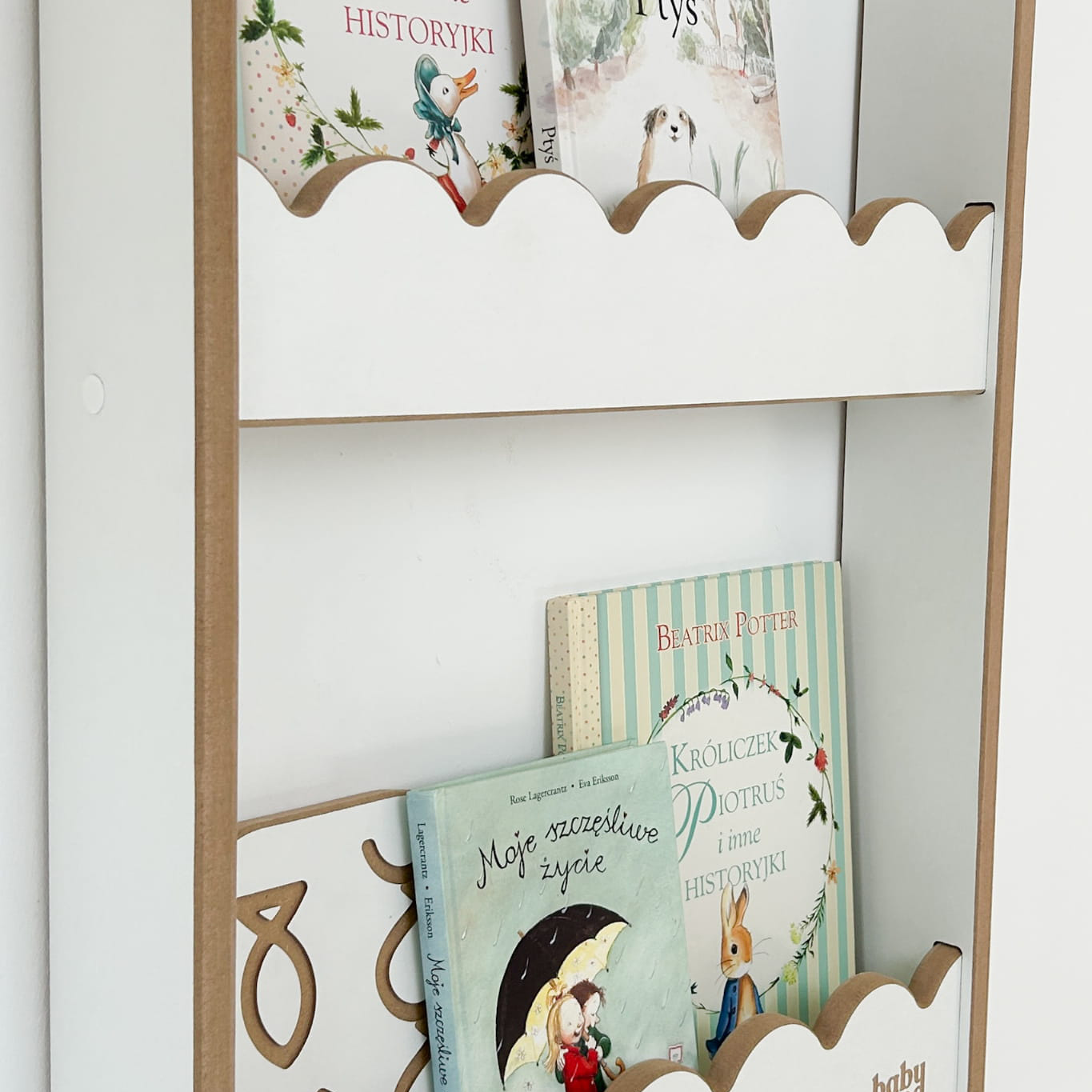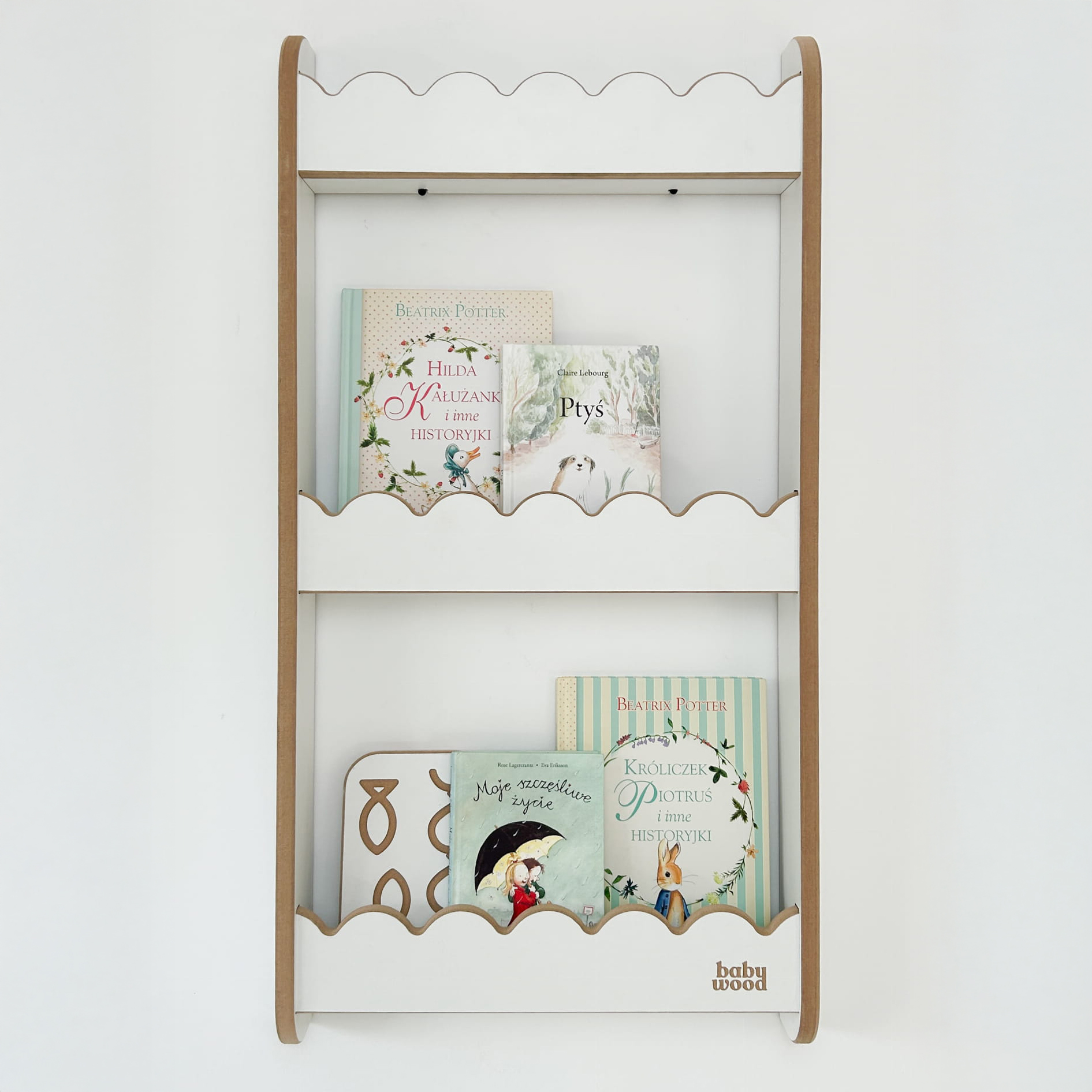 Lentynos dizainas subtilus ir šiltas – banguotas kraštas suteikia minkštumo ir paverčia knygas interjero dalimi, o ne tik laikomu daiktu. Ji puikiai dera tiek moderniame, tiek klasikiniame vaikų kambaryje. Galimi du spalviniai variantai – natūrali medžio spalva arba balta – todėl lentyną lengva priderinti prie esamo interjero.