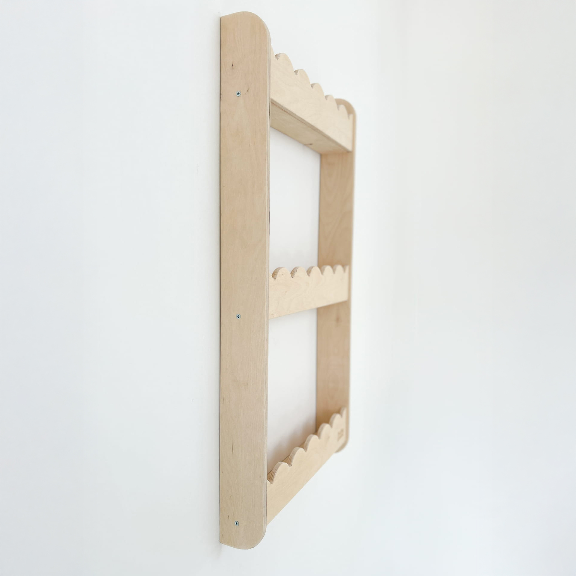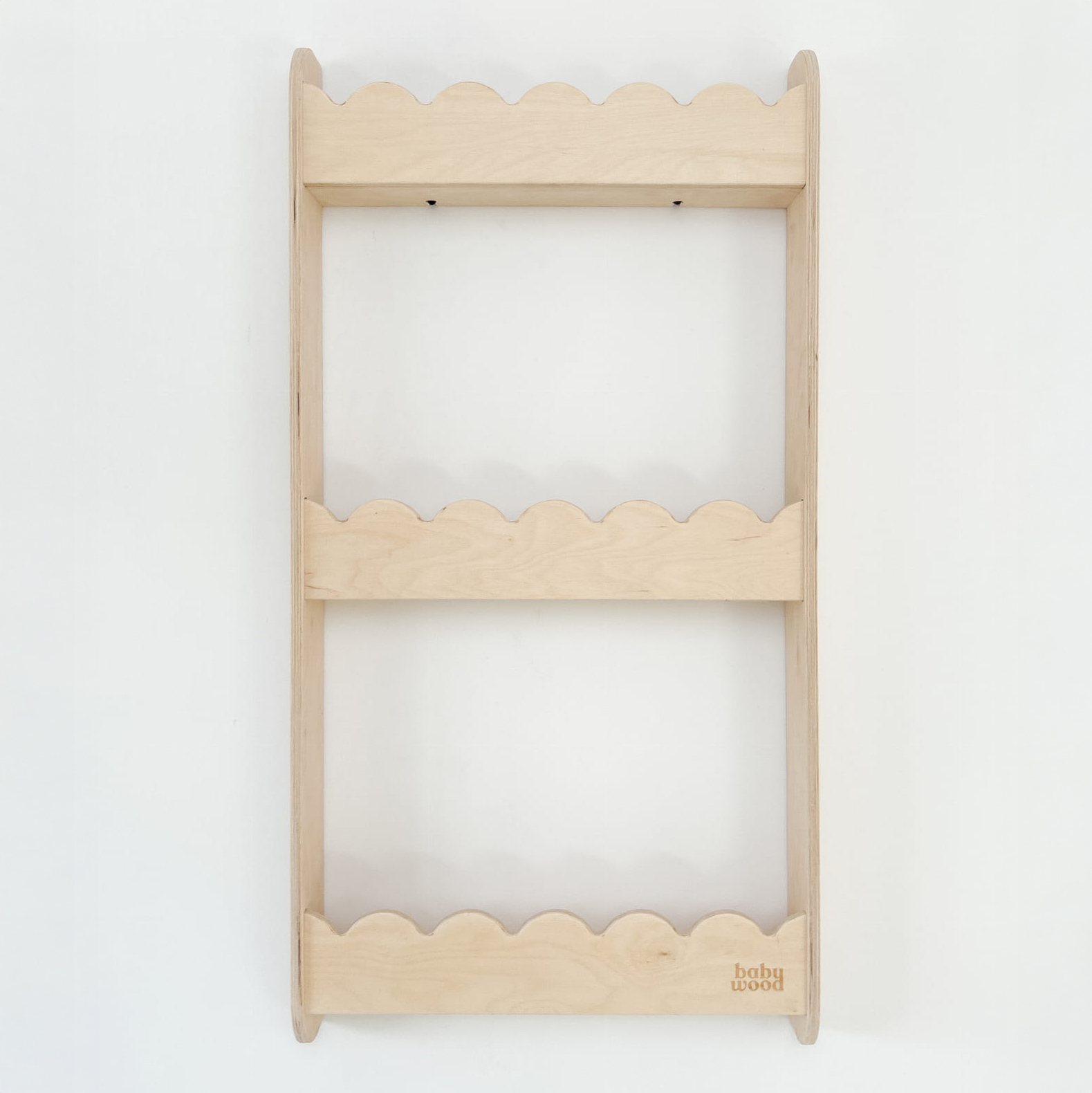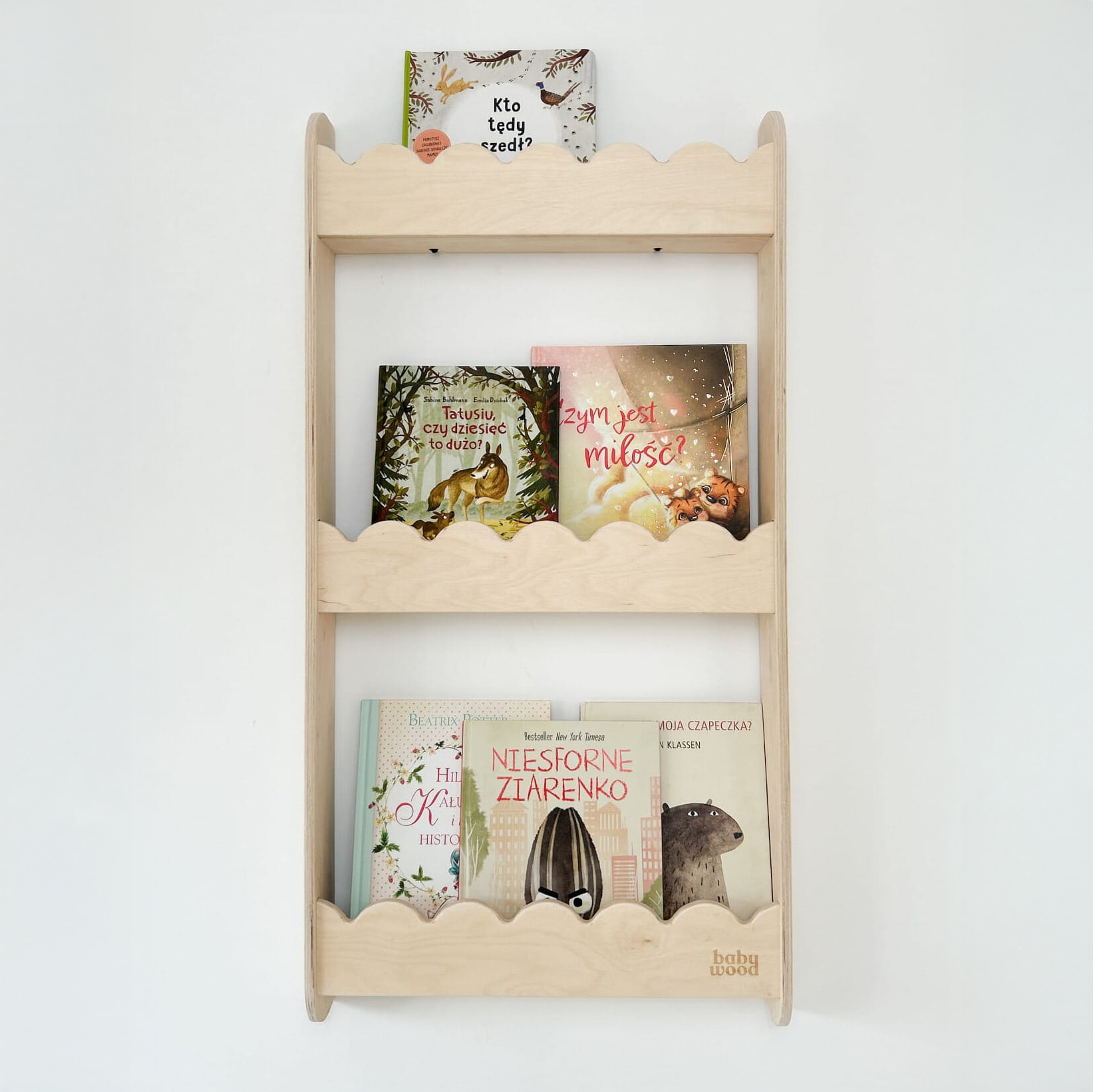 Lentynos dizainas subtilus ir šiltas – banguotas kraštas suteikia minkštumo ir paverčia knygas interjero dalimi, o ne tik laikomu daiktu. Ji puikiai dera tiek moderniame, tiek klasikiniame vaikų kambaryje. Galimi du spalviniai variantai – natūrali medžio spalva arba balta – todėl lentyną lengva priderinti prie esamo interjero.