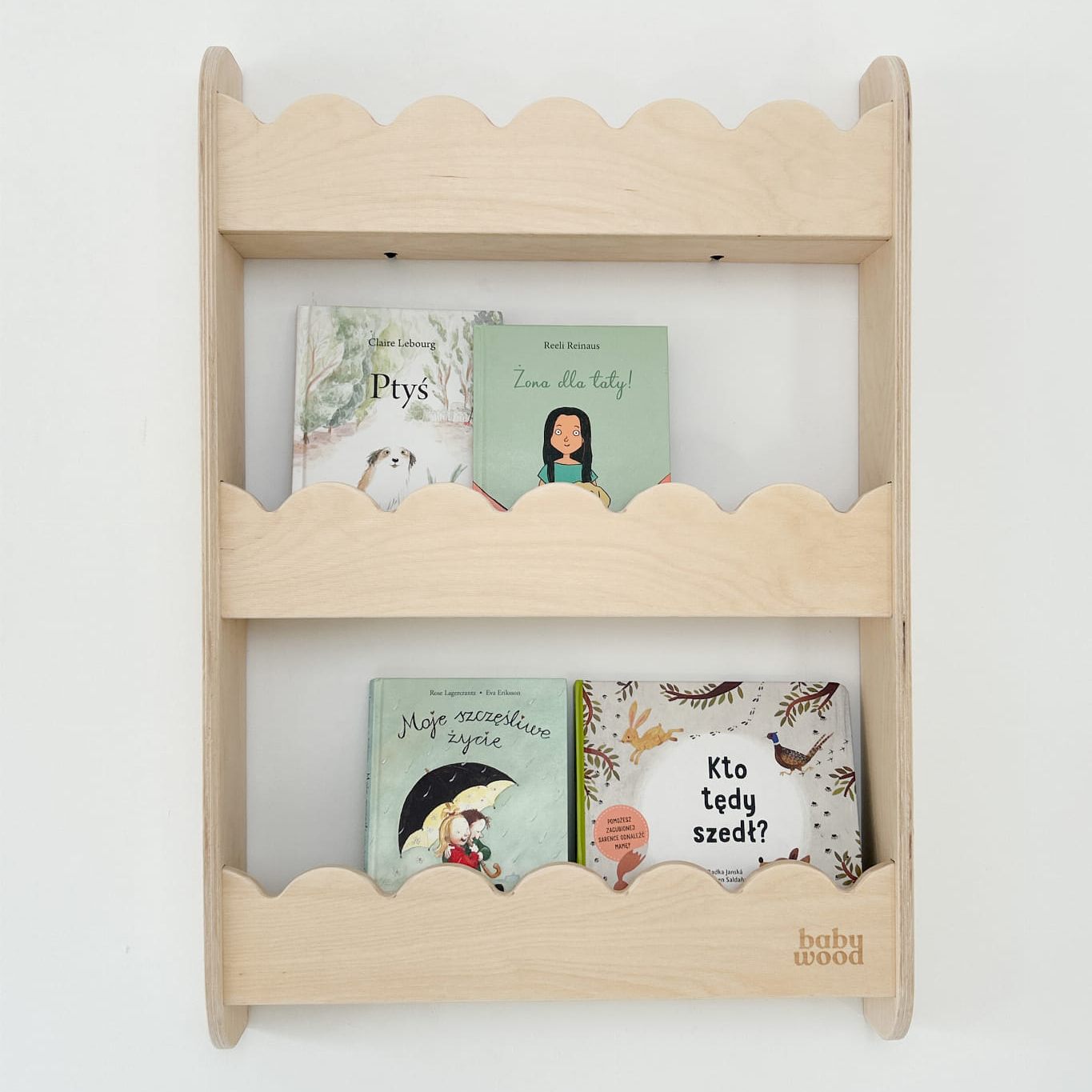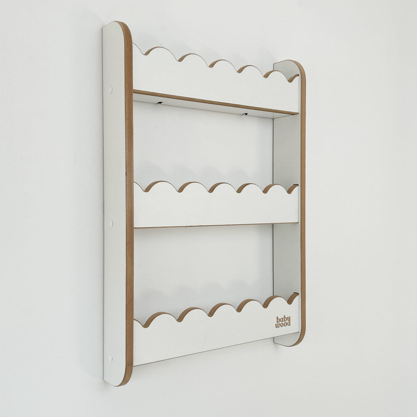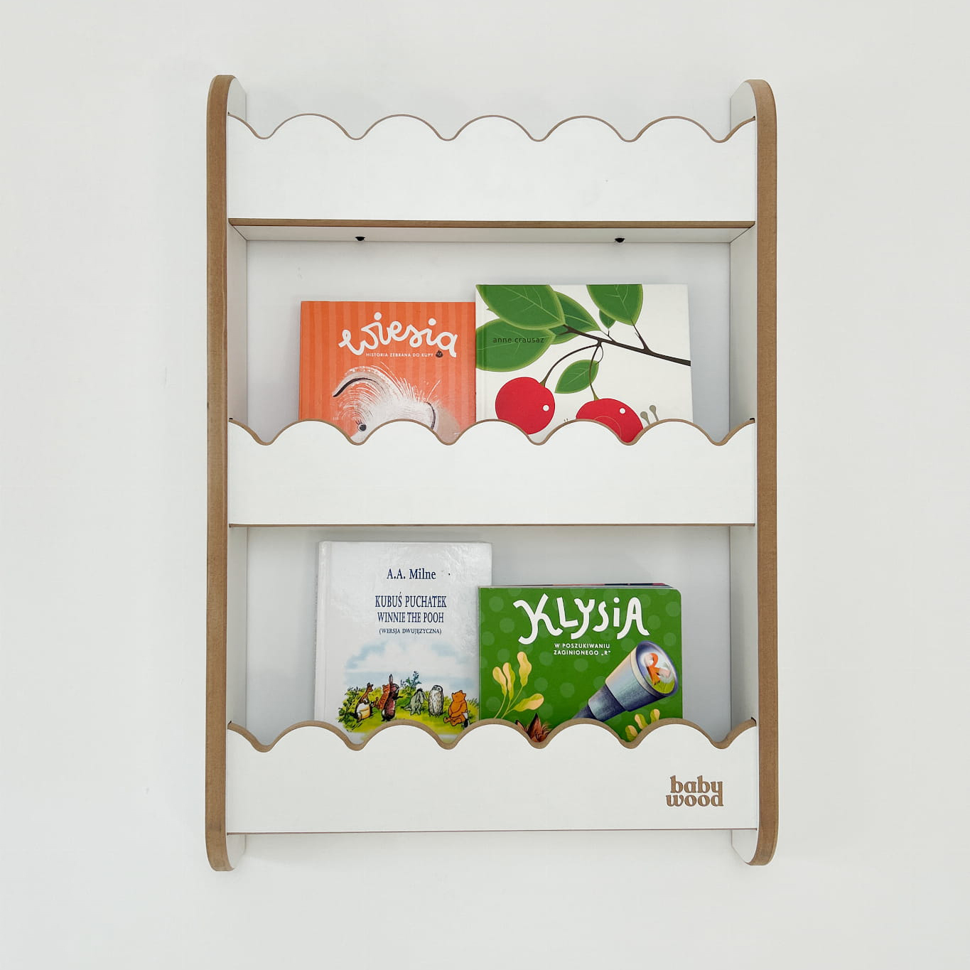 Lentynos dizainas subtilus ir šiltas – banguotas kraštas suteikia minkštumo ir paverčia knygas interjero dalimi, o ne tik laikomu daiktu. Ji puikiai dera tiek moderniame, tiek klasikiniame vaikų kambaryje. Galimi du spalviniai variantai – natūrali medžio spalva arba balta – todėl lentyną lengva priderinti prie esamo interjero.