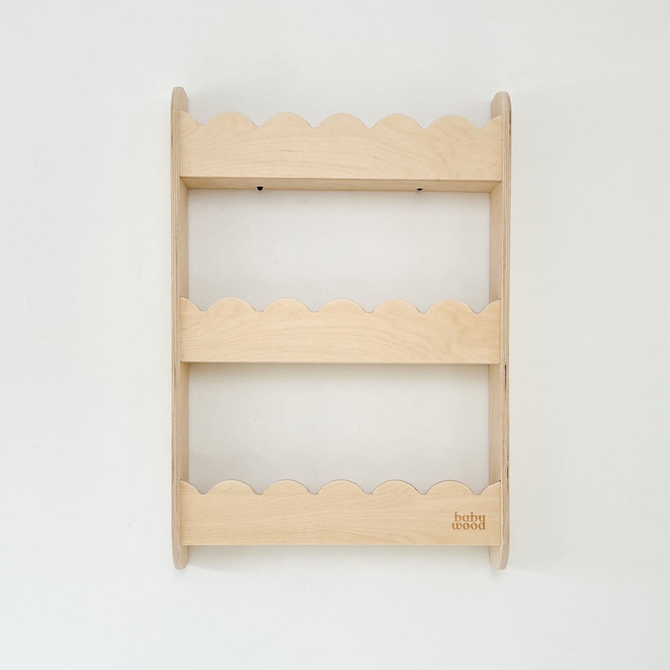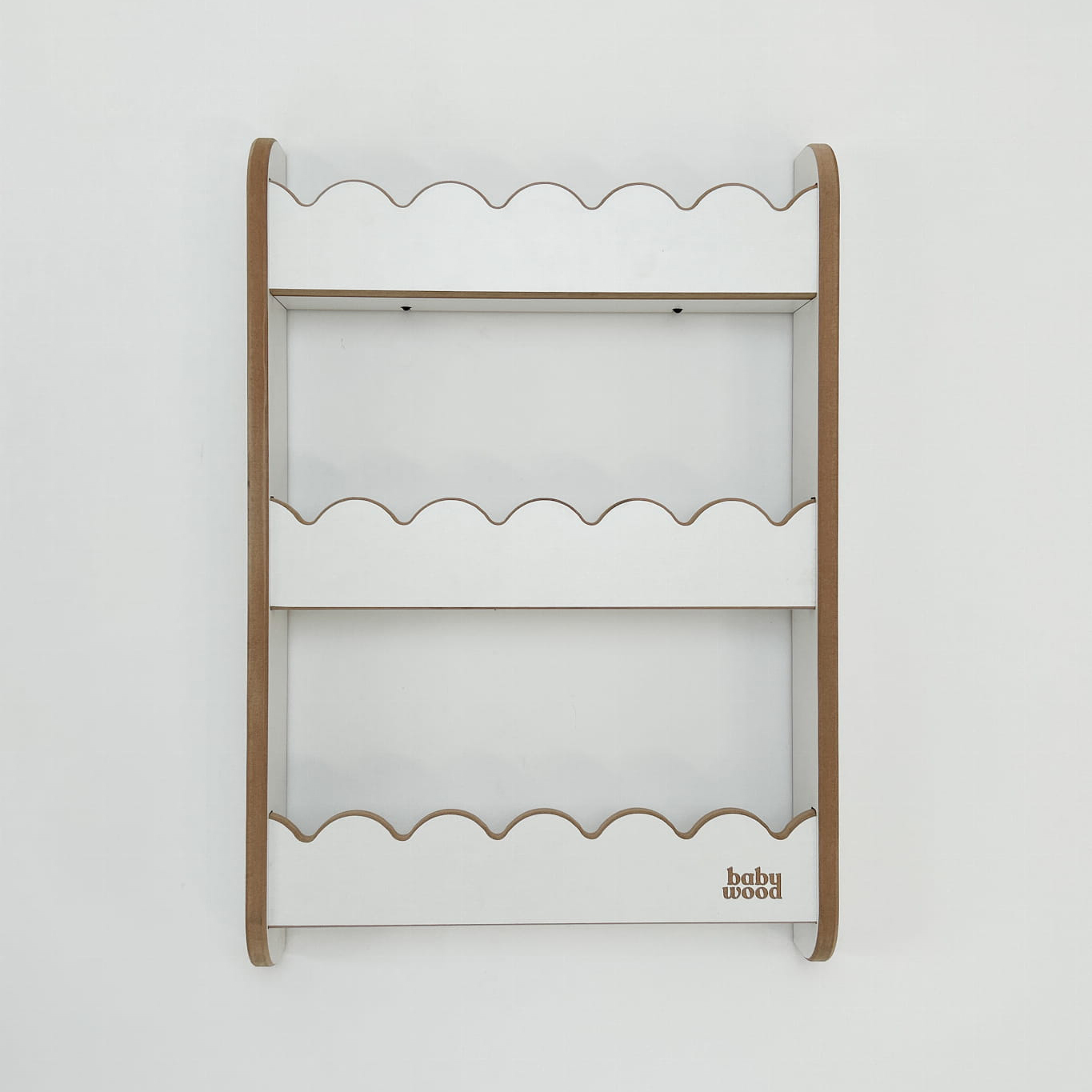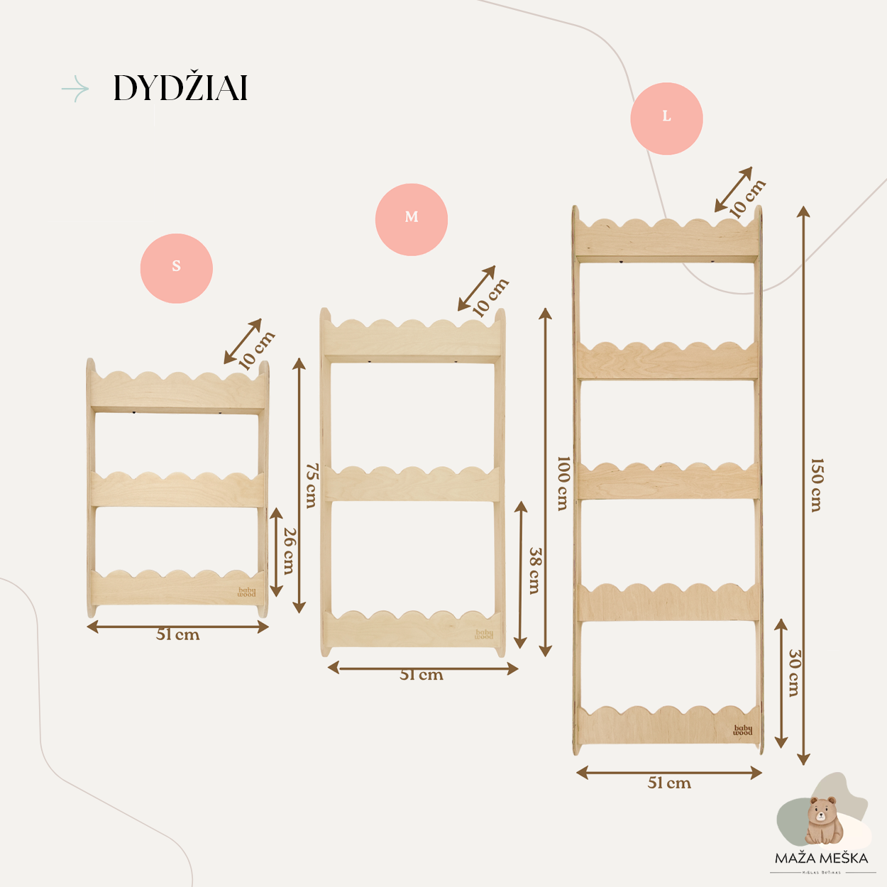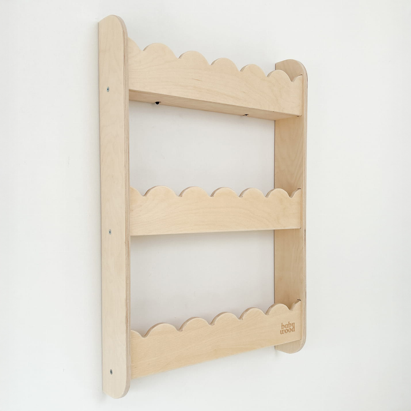 Lentynos dizainas subtilus ir šiltas – banguotas kraštas suteikia minkštumo ir paverčia knygas interjero dalimi, o ne tik laikomu daiktu. Ji puikiai dera tiek moderniame, tiek klasikiniame vaikų kambaryje. Galimi du spalviniai variantai – natūrali medžio spalva arba balta – todėl lentyną lengva priderinti prie esamo interjero.