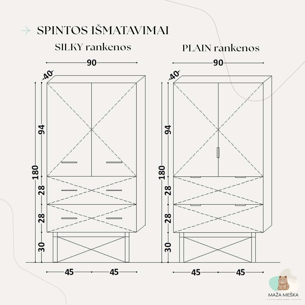 | Spintos spalva | Ąžuolas, Baltas ąžuolas, Black, Brick, Bukas, Dusty pink, Green, Ice blue, Jungle, Kašmyras, Light grey, Light mustard, Lilly, Mint blue, Oceanic, Pistacija, Plum, Riešutas, Taupe, White |