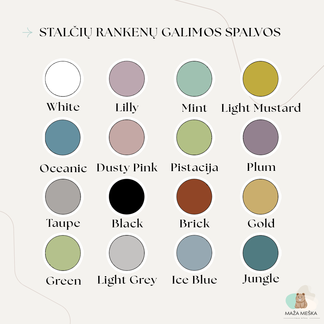 | Rankenų spalva | Black, Brick, Dusty Pink, Gold, Green, Ice Blue, Jungle, Light Grey, Light Mustard, Lilly, Mint, Oceanic, Pistacija, Plum, Taupe, White |