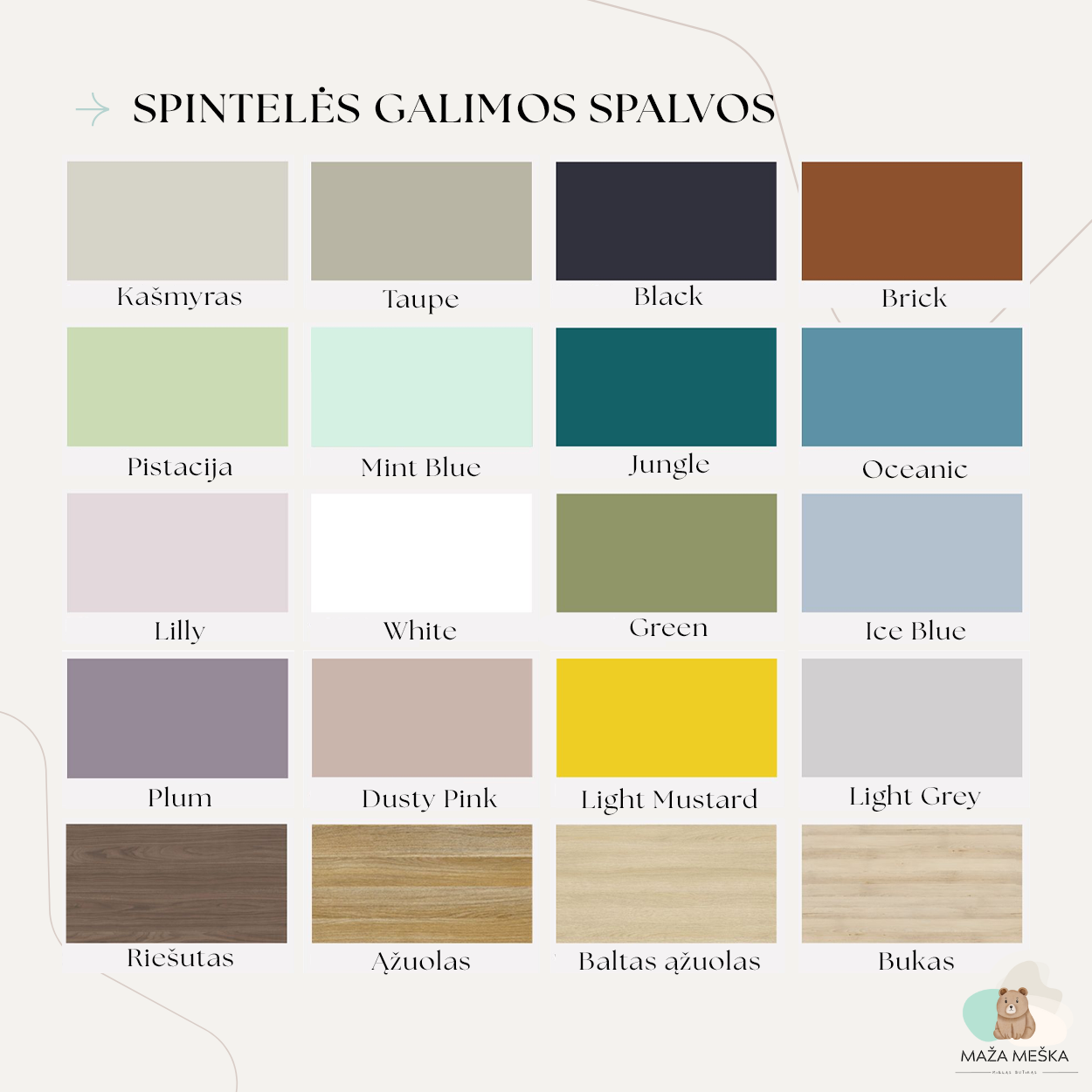 | Spintelės spalva | Baltas ąžuolas, Black, Brick, Dusty pink, Green, Ice blue, Jungle, Kašmyras, Light grey, Light mustard, Lilly, Medis: ąžuolas, Medis: bukas, Medis: riešutas, Mint blue, Oceanic, Pistacija, Plum, Taupe, White |