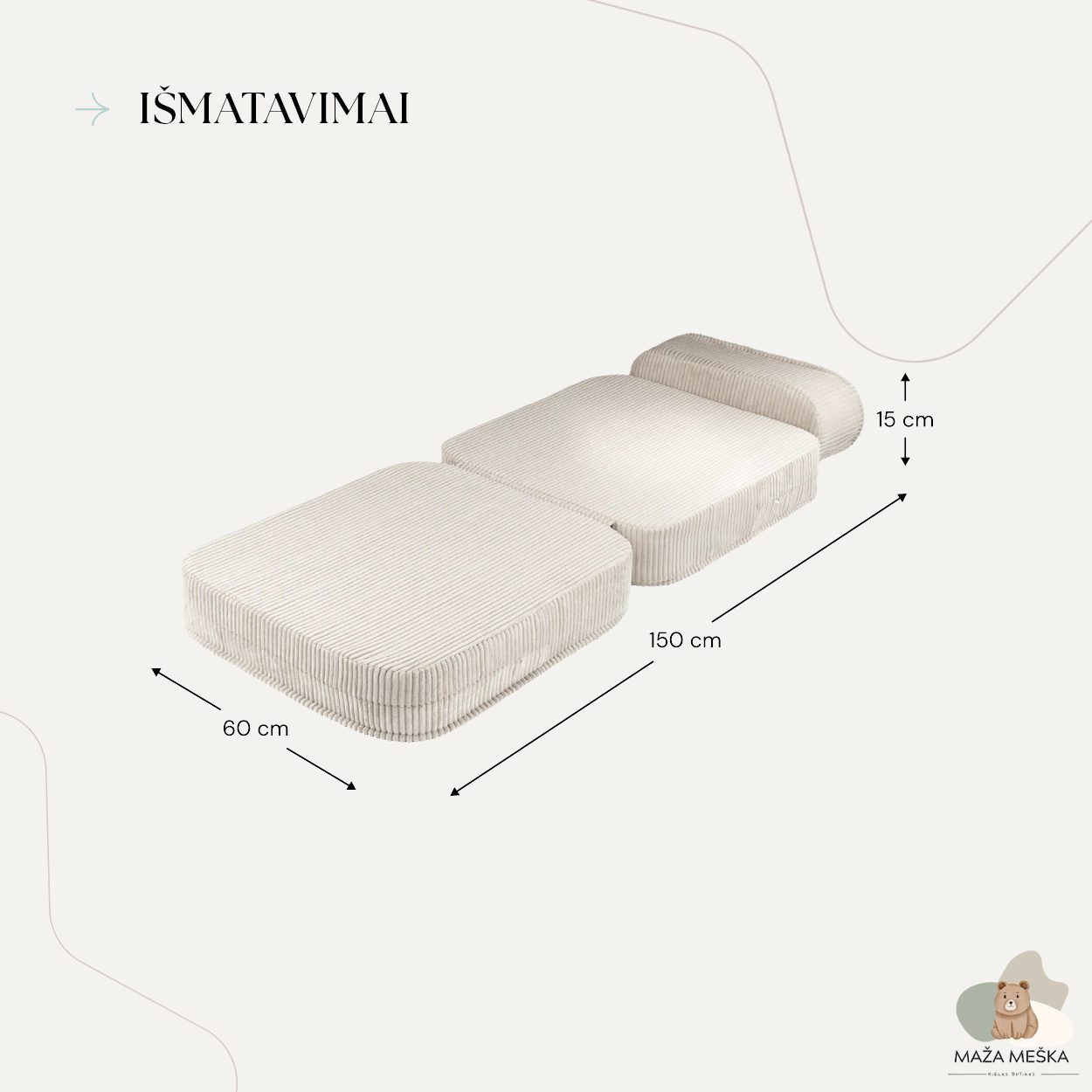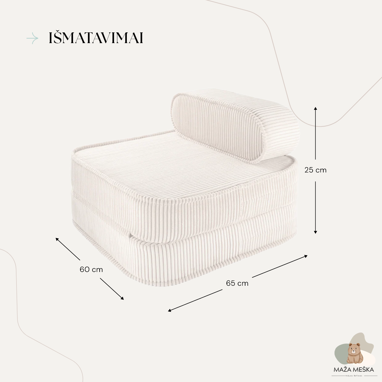 2-in-1 funkcionalumas: dieną – tai patogi kėdė skaitymui, piešimui ar pokalbiams su draugais, o vakare – išskleidžiama į 150 cm ilgio ir 60 cm pločio čiužinį, puikiai tinkantį nakvynėms ar poilsio valandėlėms. Sulankstyta ji užima nedaug vietos (65x60x25 cm), tad kambarys visada išlieka erdvus.