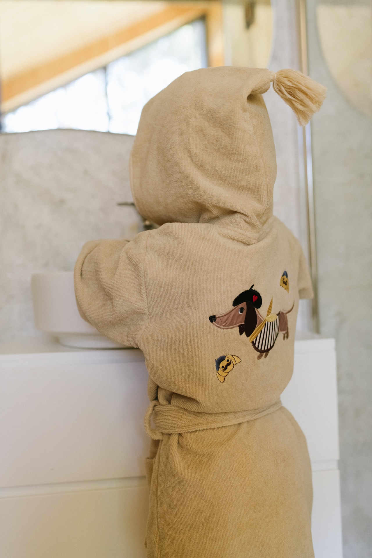Vaikiškas Chalatas TAKSIUKAS iš bambuko – nepakeičiamas pasirinkimas kiekvienam mažyliui po maudynių namuose, baseine ar paplūdimyje. Šis chalatas sujungia komfortą, praktiškumą ir stilingą dizainą, todėl taps mėgstamiausiu jūsų vaiko aksesuaru. Chalatas yra ypač minkštas, švelnus odai ir maksimaliai sugeriantis drėgmę, todėl po vonios ar maudynių jūsų vaikas jausis sausas ir patogiai.