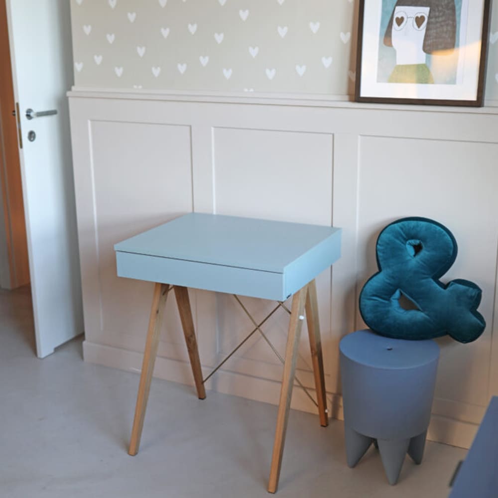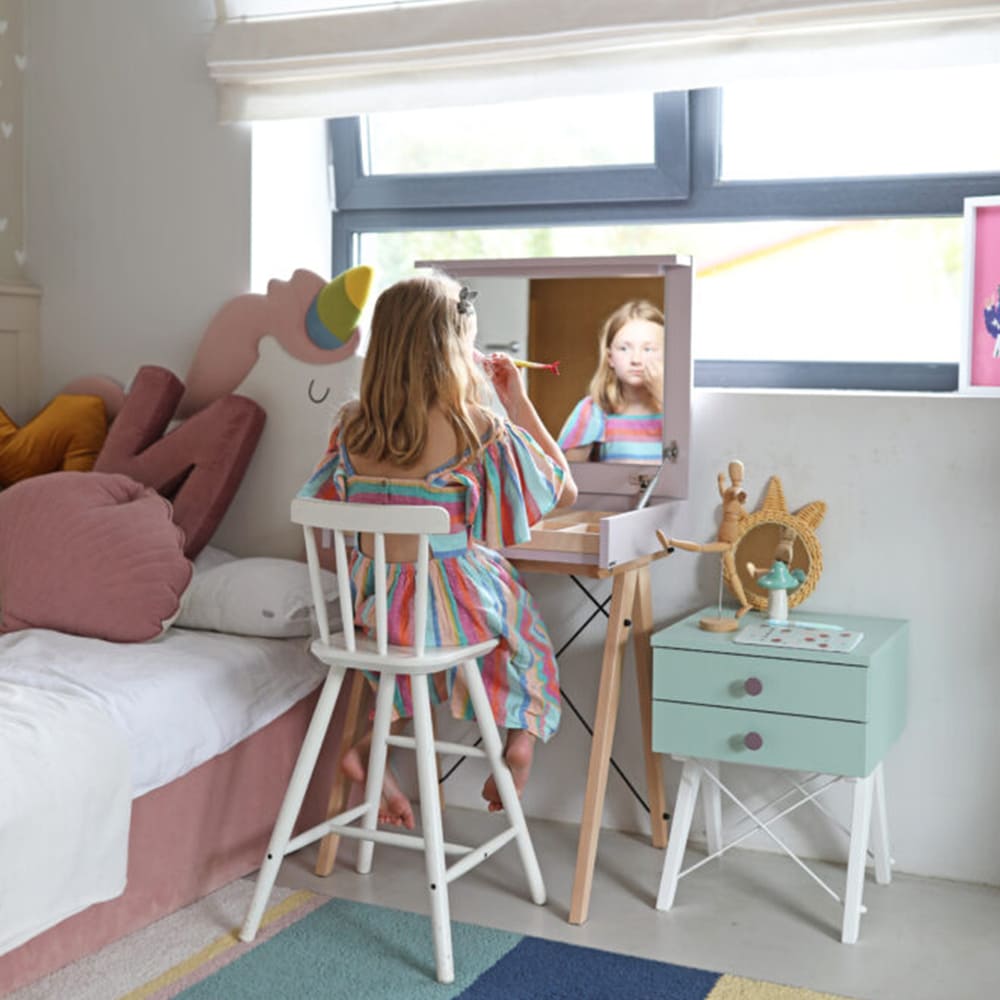 Jaukus kampelis kambaryje, kuriame auga džiaugsmas ir gražios vaikystės akimirkos.