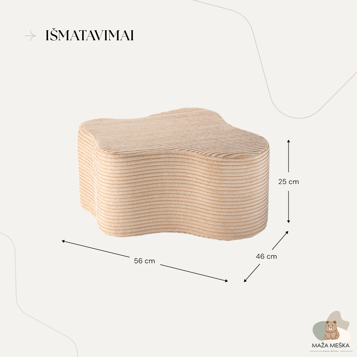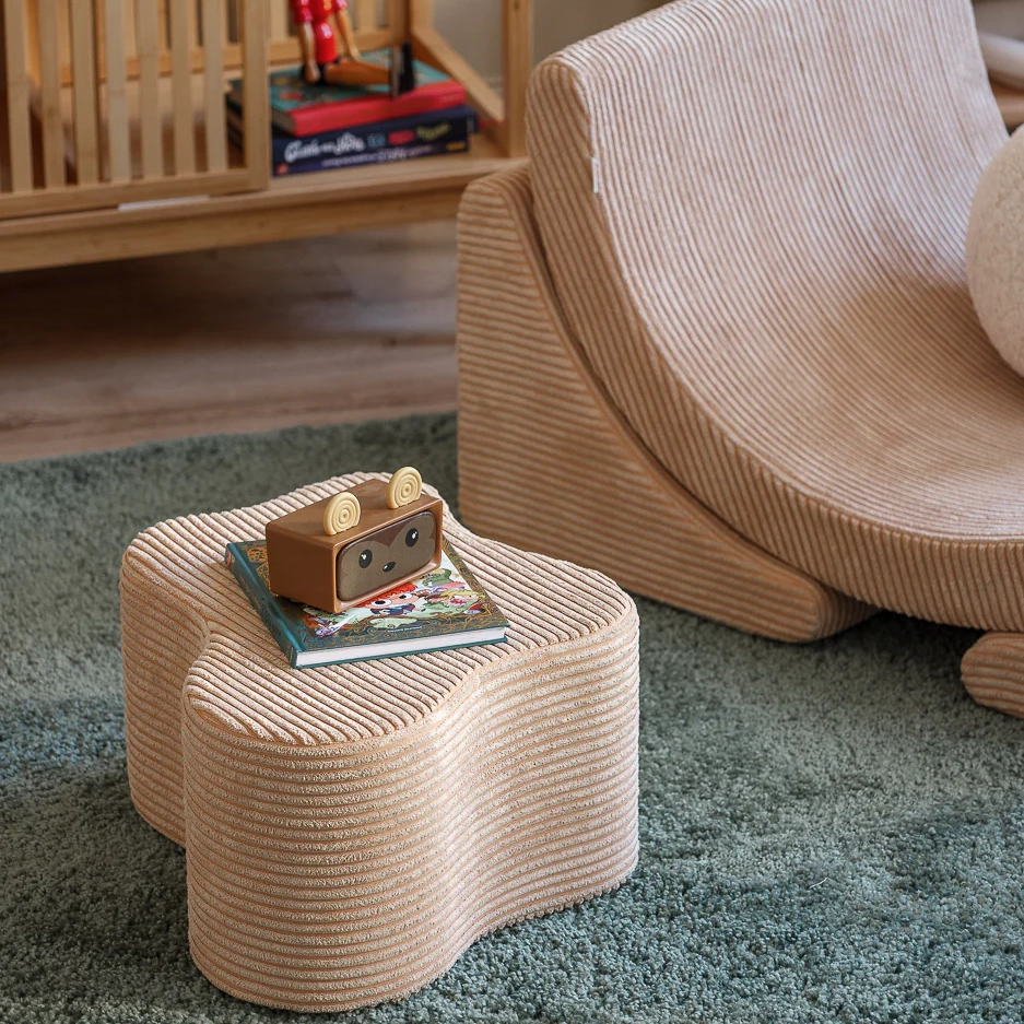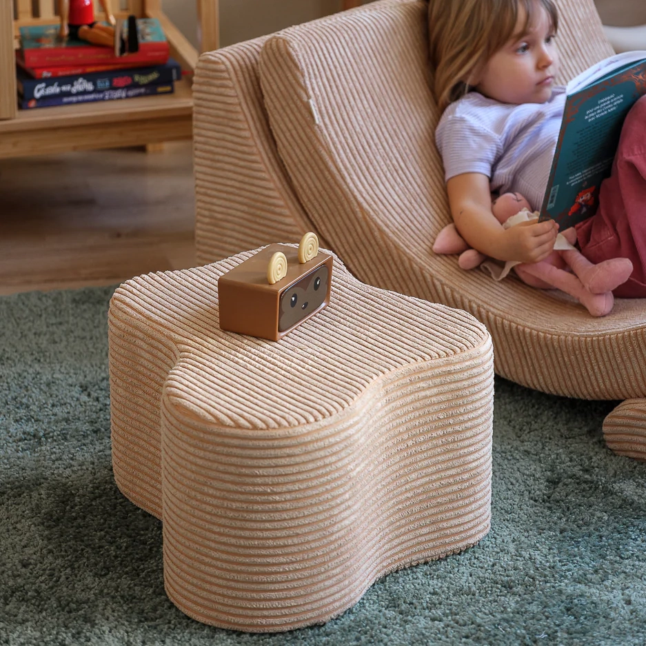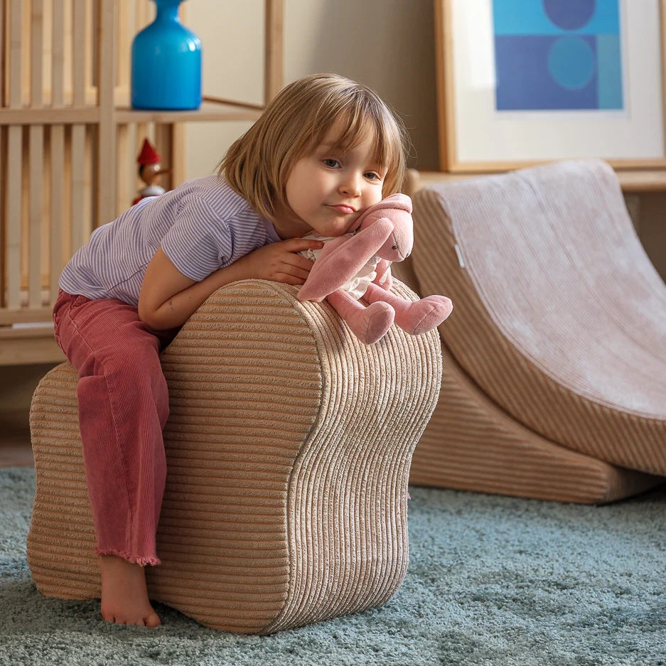 Pufas pagamintas iš minkšto, aukštos kokybės velveto (kordo), kuris ne tik suteikia prabangų pojūtį liečiant, bet ir yra atsakingas pasirinkimas. Audinys turi GRS® sertifikatą ir pagamintas iš perdirbtų PET butelių. Taip kiekvienas pufas prisideda prie tvaresnės ateities ir moko vaikus nuo mažens vertinti gamtą.