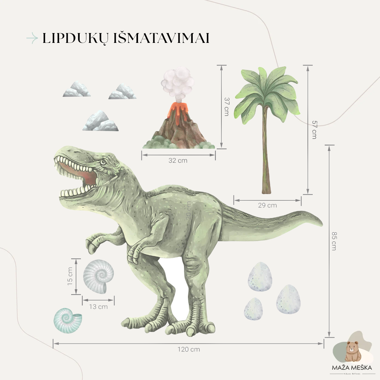 Rinkinį sudaro keli atskiri elementai, kuriuos galima laisvai komponuoti pagal vaiko kambario dydį ir fantaziją: T-REX, vulkanas, 3 uolos, 3 kiaušiniai, 2 kriauklės ir palmė. Toks išdėstymas leidžia kurti skirtingas scenas – nuo ramių priešistorinių peizažų iki aktyvių dinozaurų nuotykių. Tikslūs kiekvieno elemento matmenys pateikti paskutinėje produkto nuotraukoje.