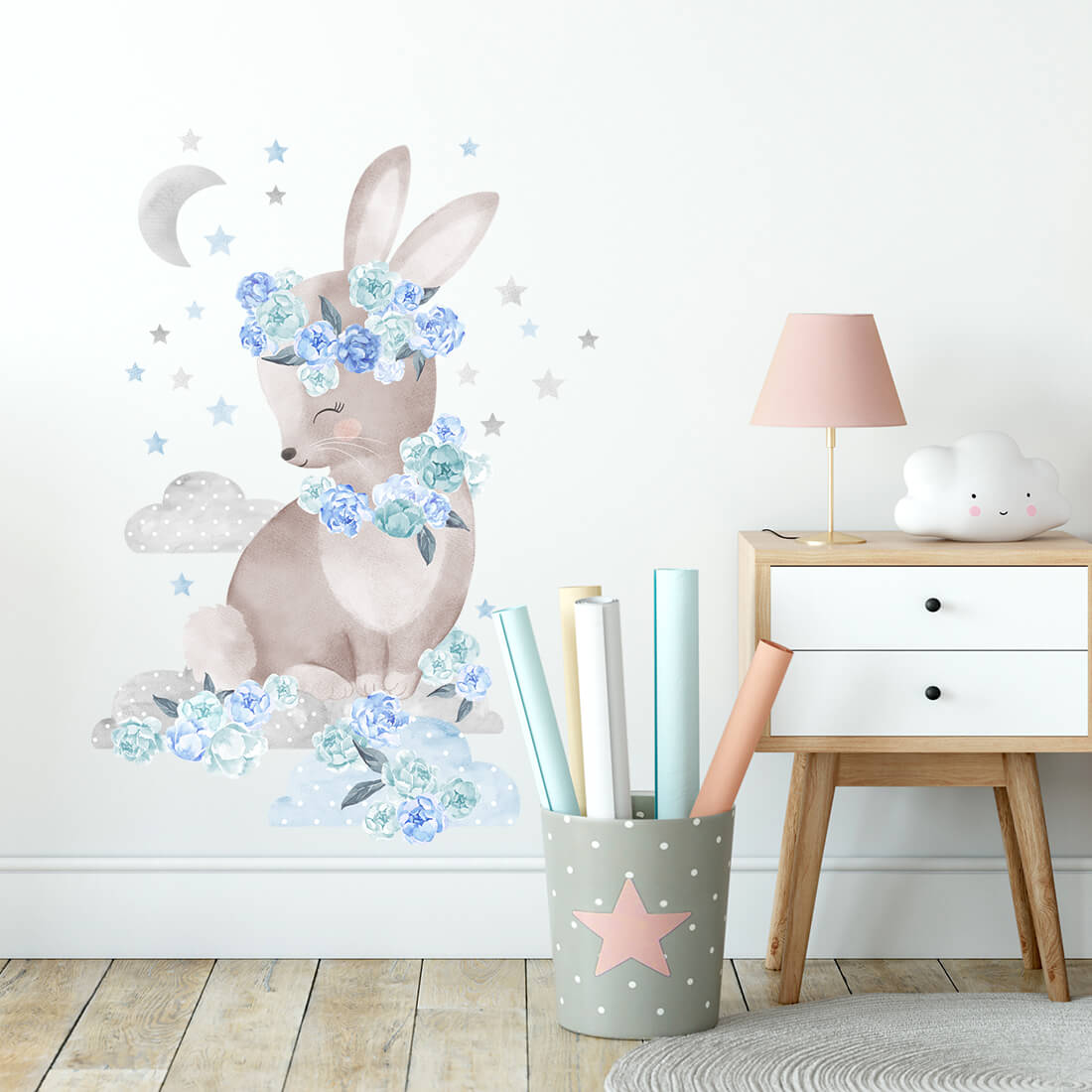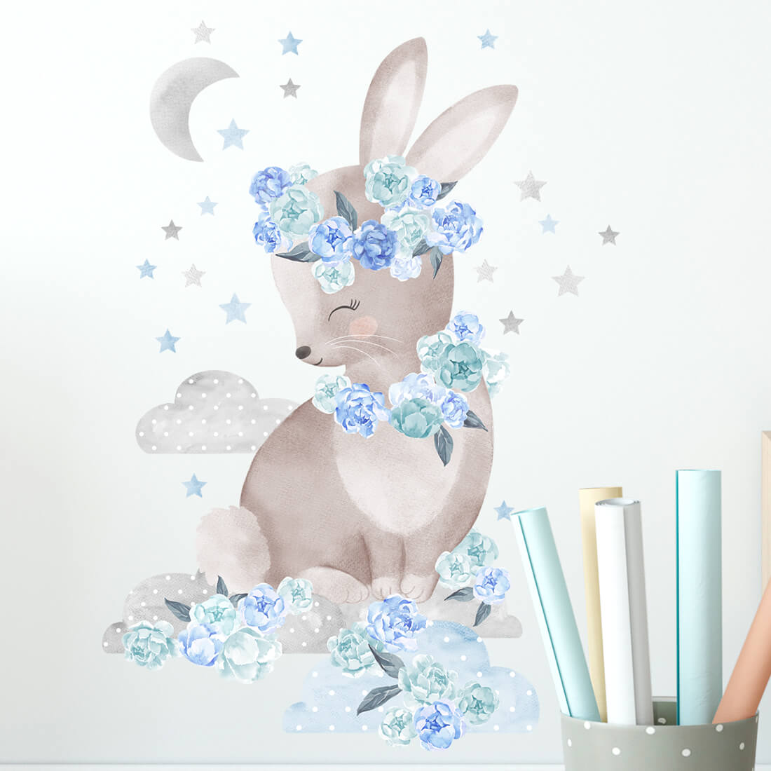 Vaikiškas sienų lipdukas „Melsvas Zuikis Puikis“ priklauso ypatingai bijūnų kolekcijai, sukurtai visiems, kurie dievina švelnius gėlių motyvus, miško gyvūnus ir pasakišką vaikų kambario nuotaiką. Tai daugiau nei sienų dekoracija – tai mažytė istorija, kuri papildo vaikų kambarį jaukumu, šiluma ir svajingumu.