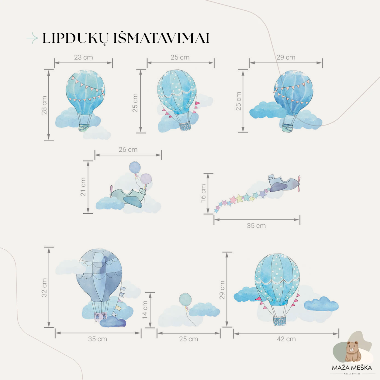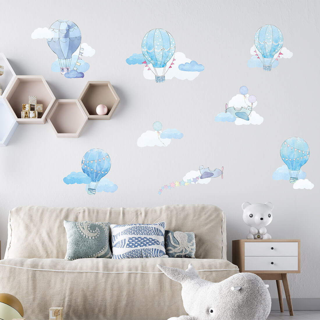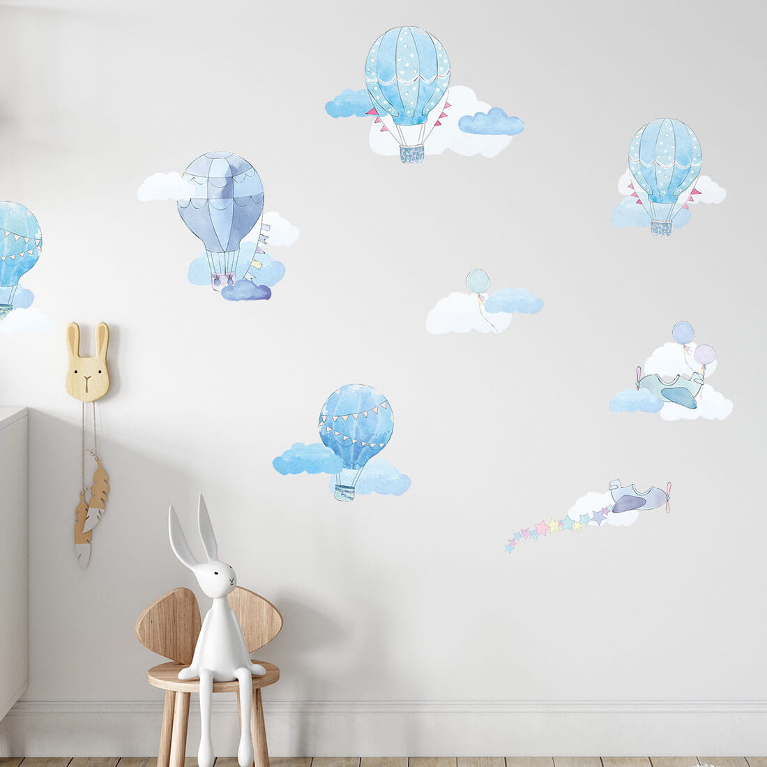 Lipdukai sukurti itin kruopščiai. Kiekviena detalė apgalvota, spalvos švelnios ir harmoningos. Melsvi tonai ramina ir padeda sukurti saugią aplinką poilsiui. Vaikai mėgsta stebėti ir ieškoti ant sienos balionėlių, lėktuvėlių bei debesų, todėl dekoracija tampa ir žaidimo dalimi.