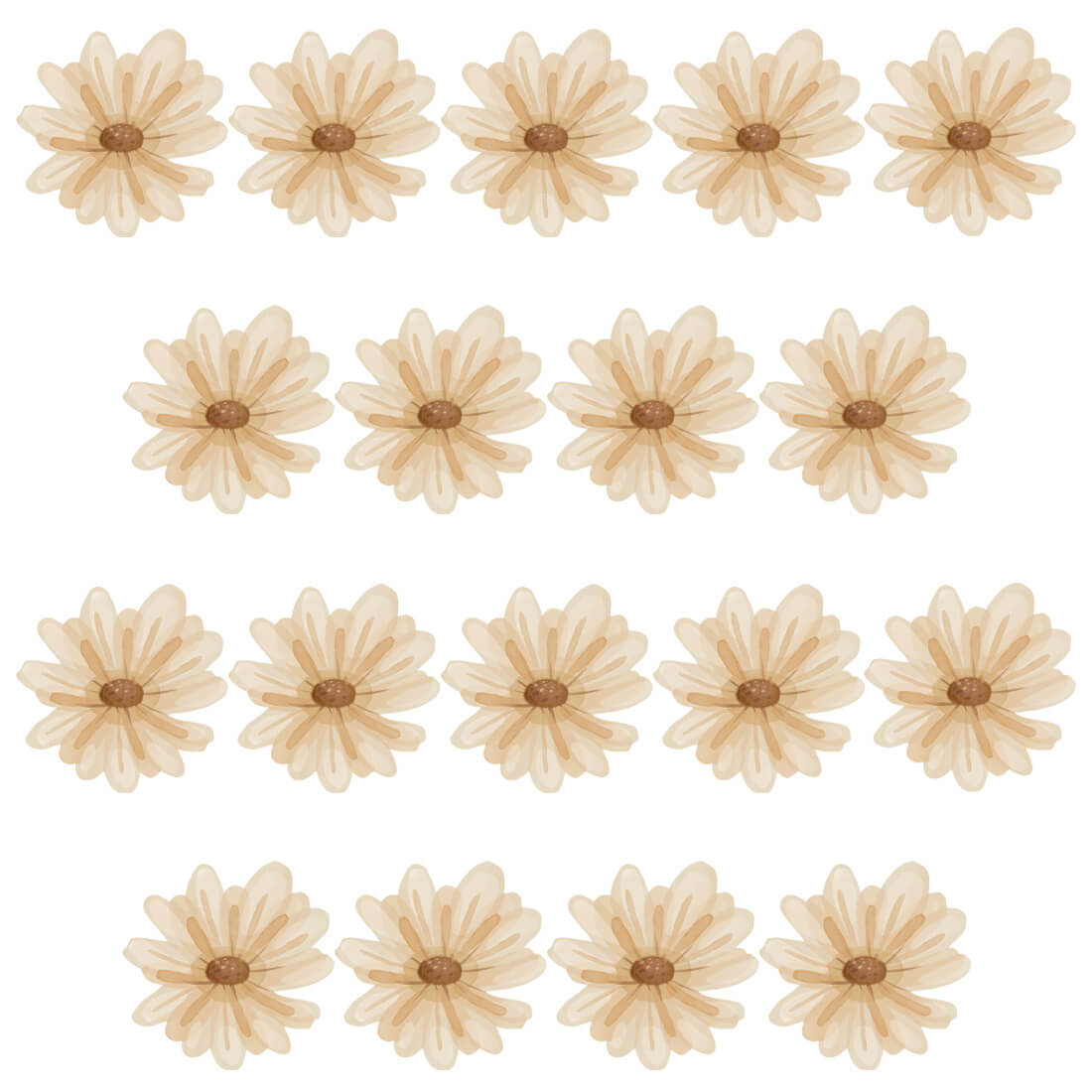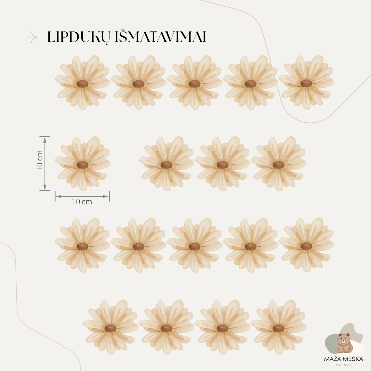 Rinkinį sudaro 18 didesnių ramunėlių (10 × 10 cm), kurios puikiai tinka laisvai komponuoti ant sienos. Lipdukus galima išdėlioti tolygiai per visą sieną, sukurti tapetų efektą, arba naudoti kaip švelnų akcentą virš lovelės, komodos ar skaitymo kampelio. Vienodas dydis ir forma leidžia sukurti tvarkingą, estetišką vaizdą, kuris neerzina ir išlieka aktualus ilgą laiką.