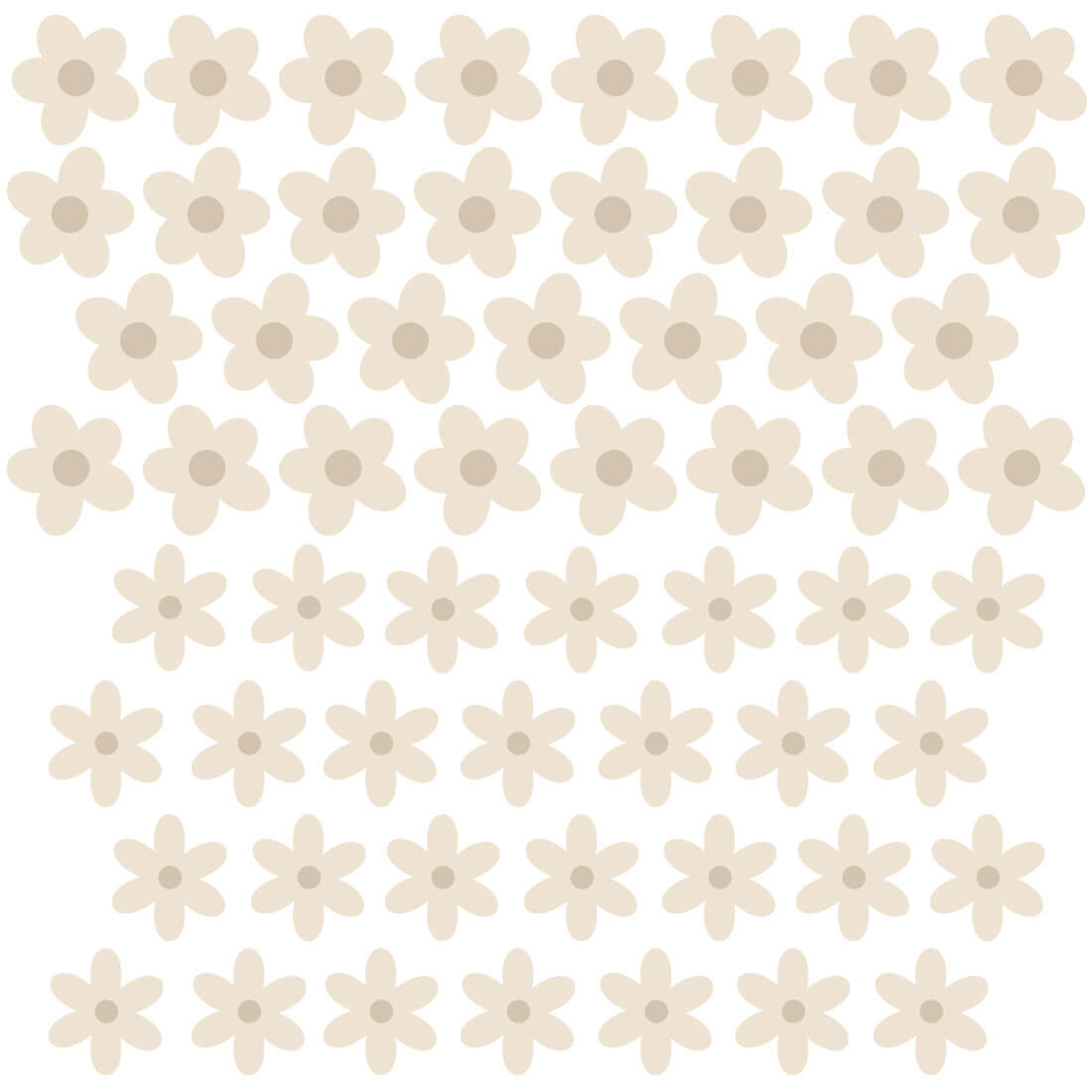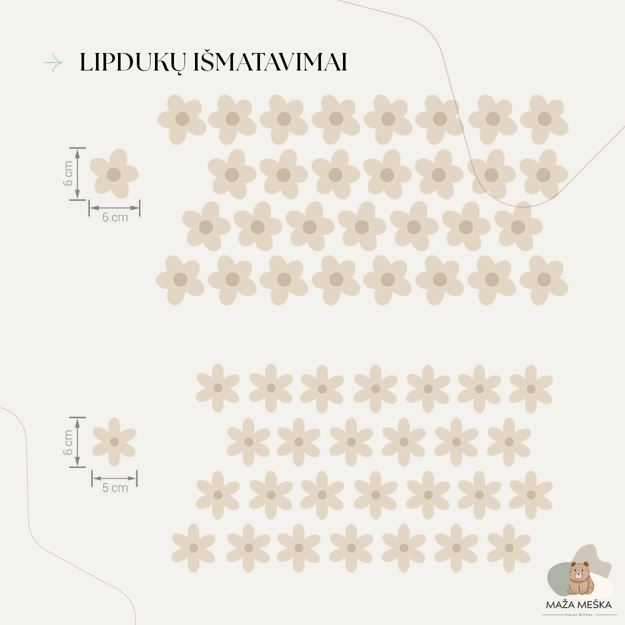 Šį rinkinį sudaro net 59 ramunėlės, dviejų skirtingų dydžių ir formų. Lipdukus galima laisvai komponuoti – išdėlioti per visą sieną, sukurti tapetų efektą, subtilų akcentą virš lovelės, komodos ar žaidimų zonos. Kiekviena siena tampa unikali ir pritaikyta būtent jūsų erdvei.