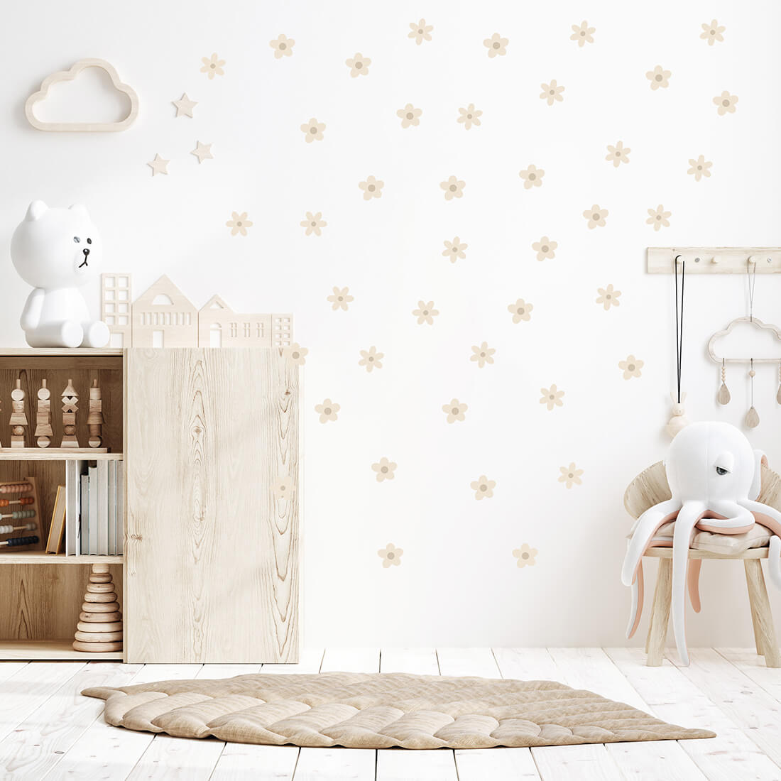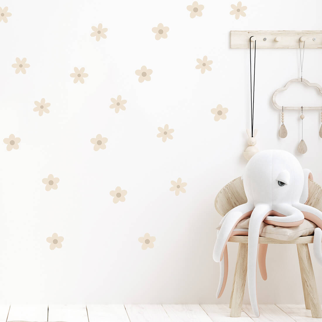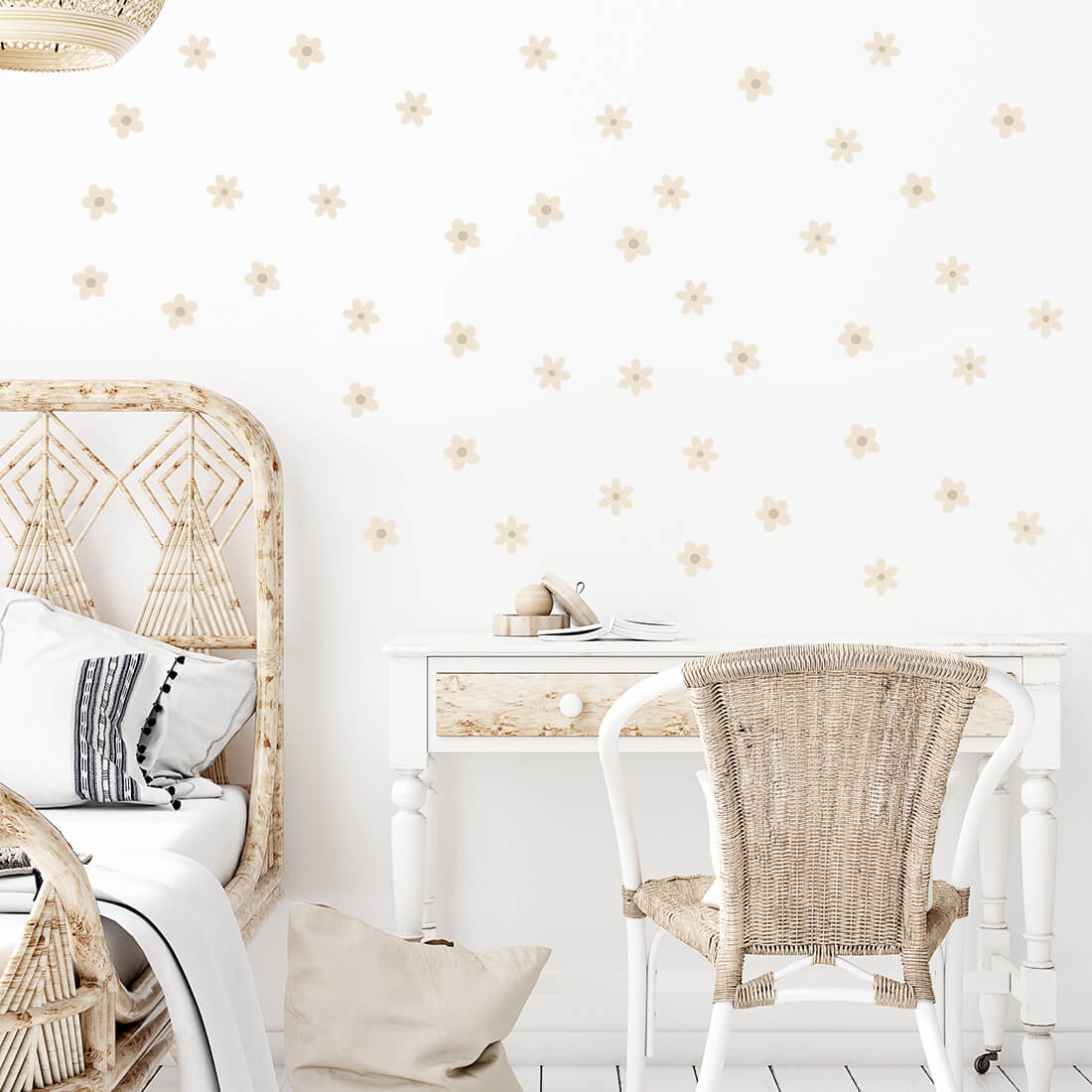 Ramunėlių motyvas sukurtas natūralių, švelnių spalvų, todėl puikiai tinka skandinaviško, boho ar minimalistinio stiliaus interjerams. Tai dekoracija, kuri neapkrauna erdvės, bet suteikia jai jaukumo ir lengvumo – idealiai tinka tiek kūdikių, tiek vyresnių vaikų kambariams.