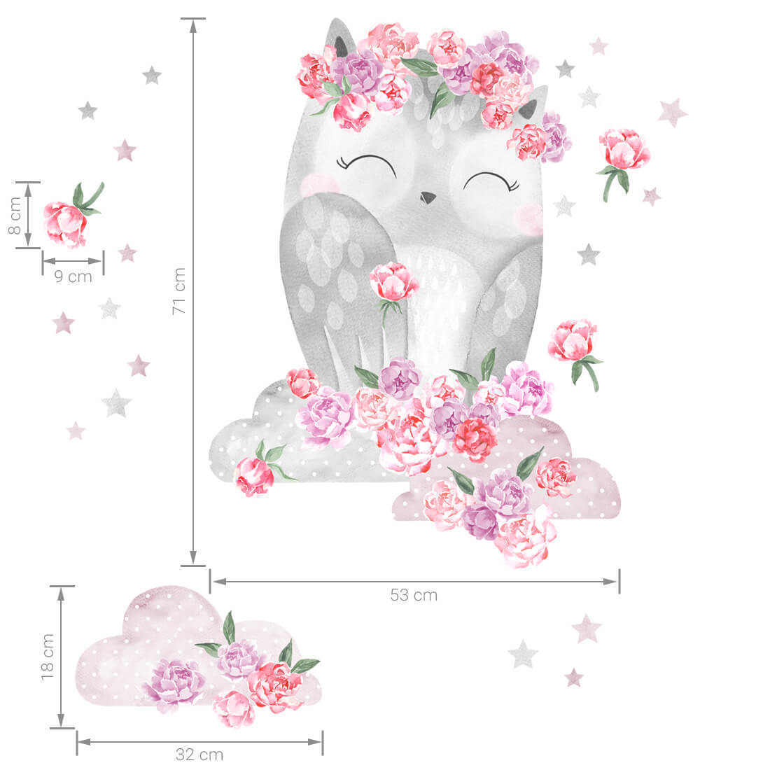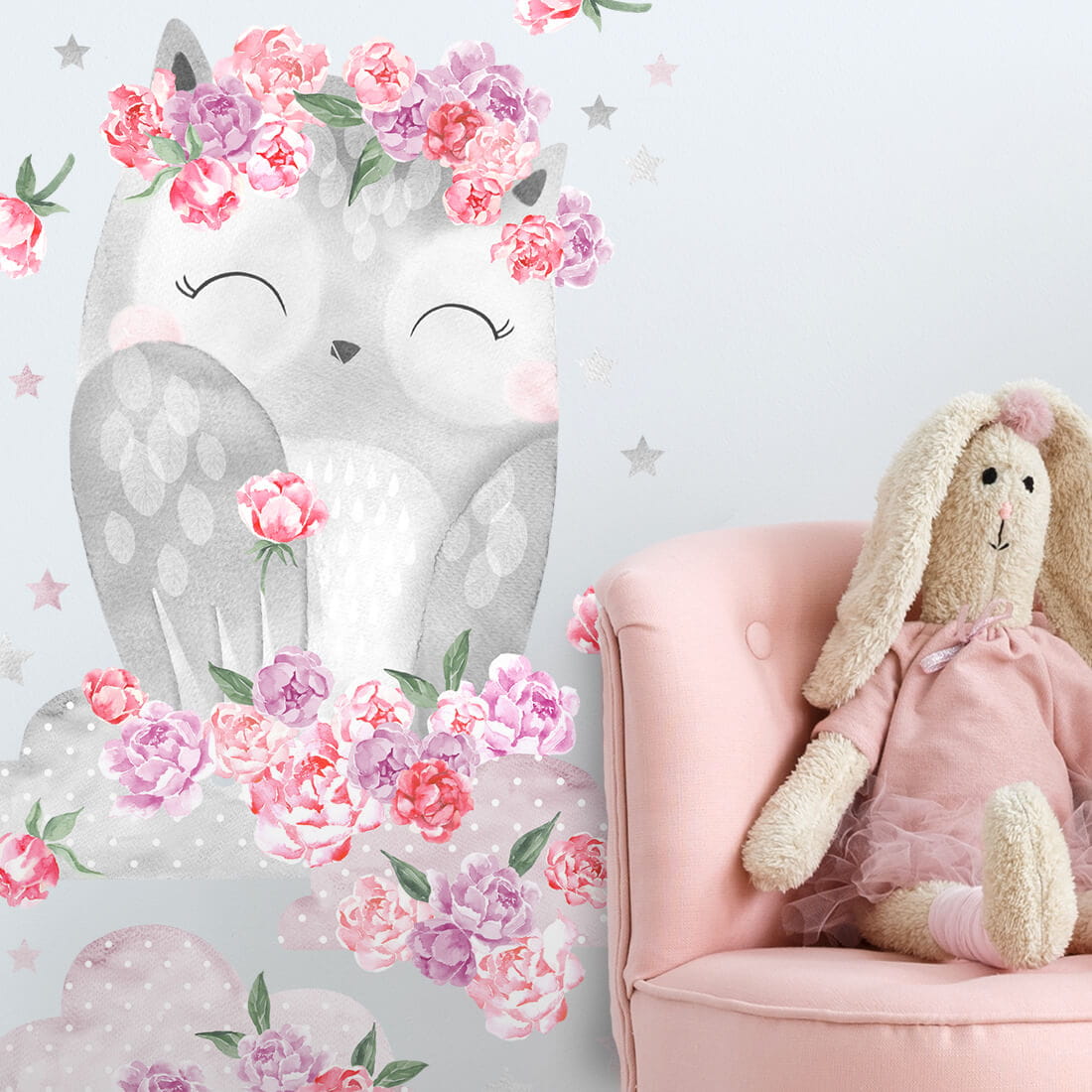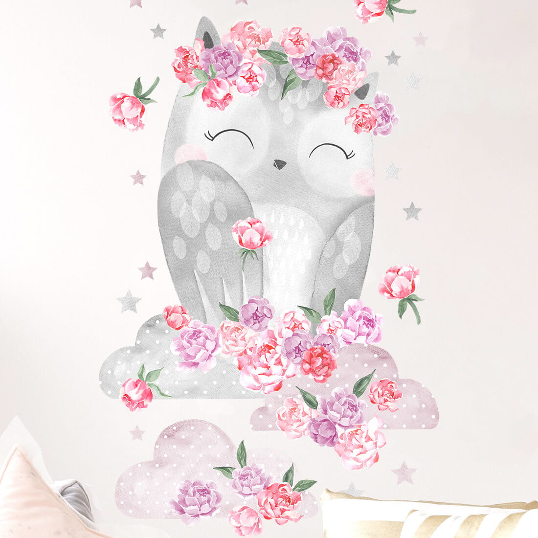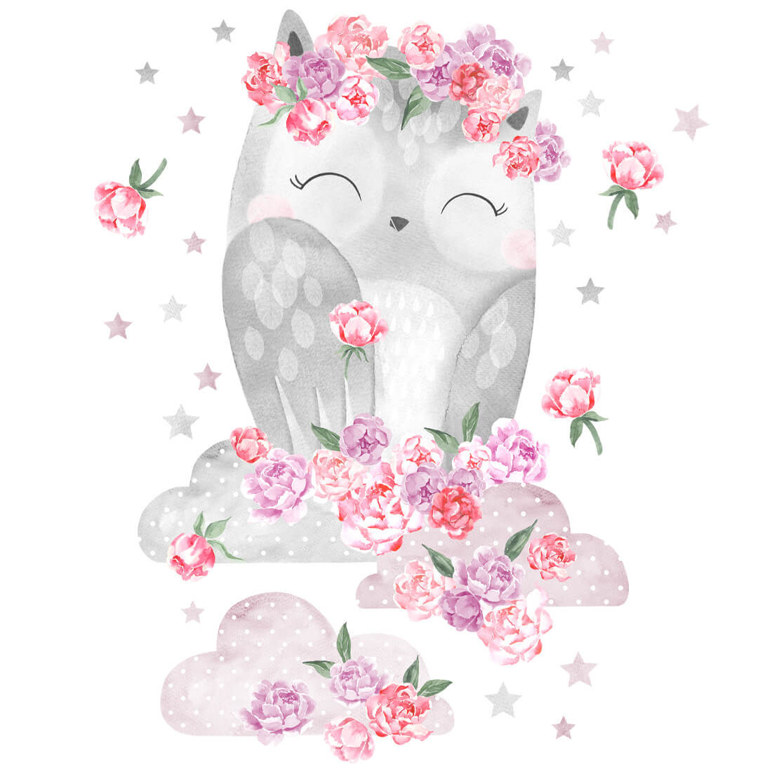 Vaikiškas sienų lipdukų Rausva pelėda Drulė rinkinys apima žavingą pelėdą su debesimis bei papildomus dekoratyvinius elementus – žvaigždutes ir gėles. Šis rinkinys puikiai tinka kuriant jaukų, ramų ir svajingą vaikų kambario interjerą.