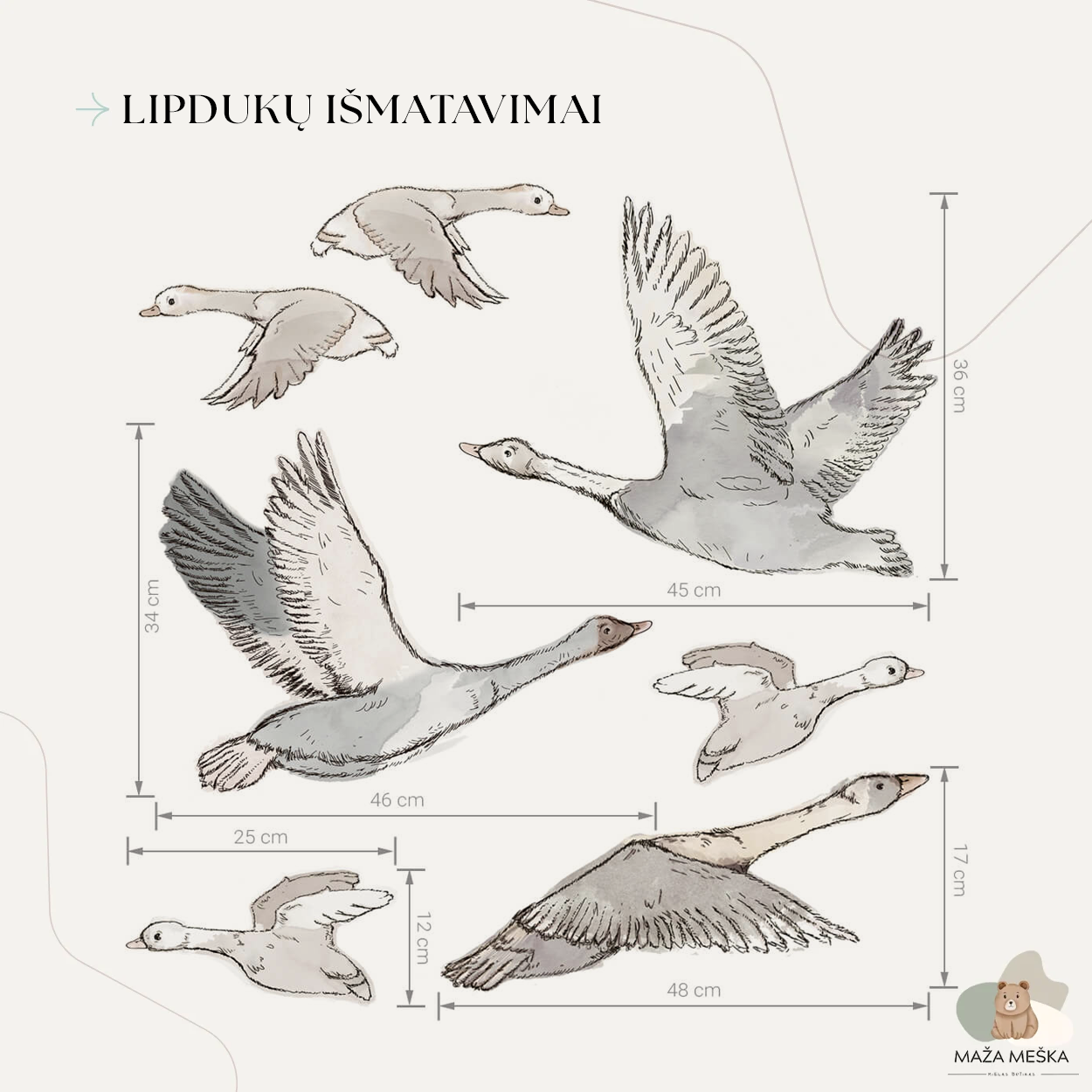Rinkinį sudaro 7 žąsys: 4 mažos žąsys, 2 vidutinės žąsys, 1 didelė žąsis. Visi elementai klijuojami atskirai. Galite juos išdėlioti pulkeliu, linija ar išskaidyti po visą sieną. Tai leidžia sukurti lengvą, ore sklendžiantį vaizdą. Tikslūs kiekvieno lipduko matmenys pateikti paskutinėje produkto nuotraukoje.