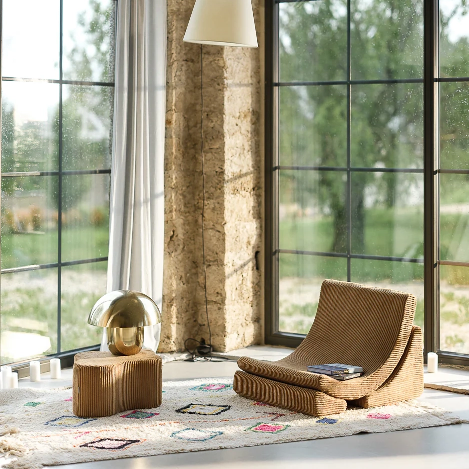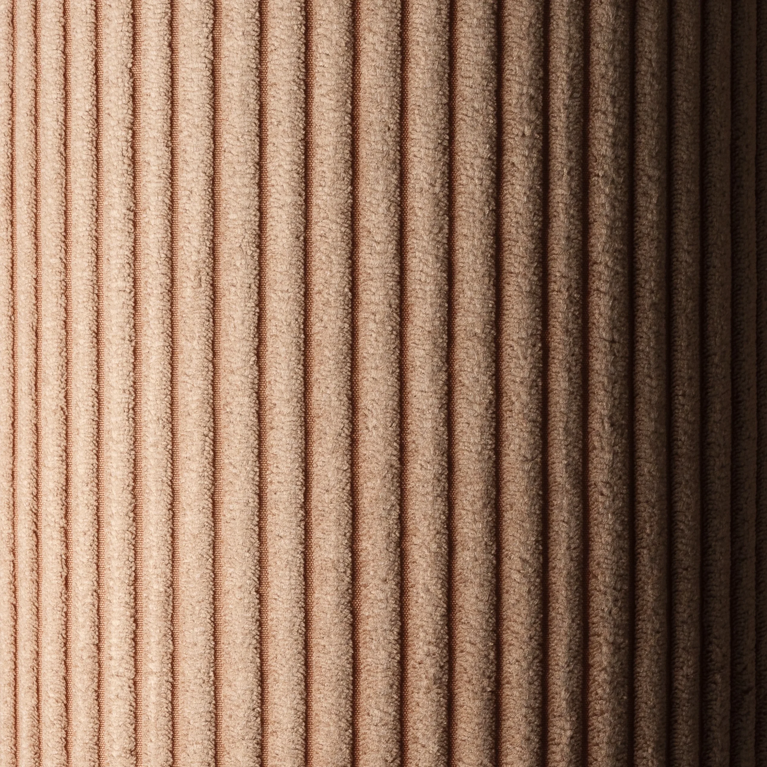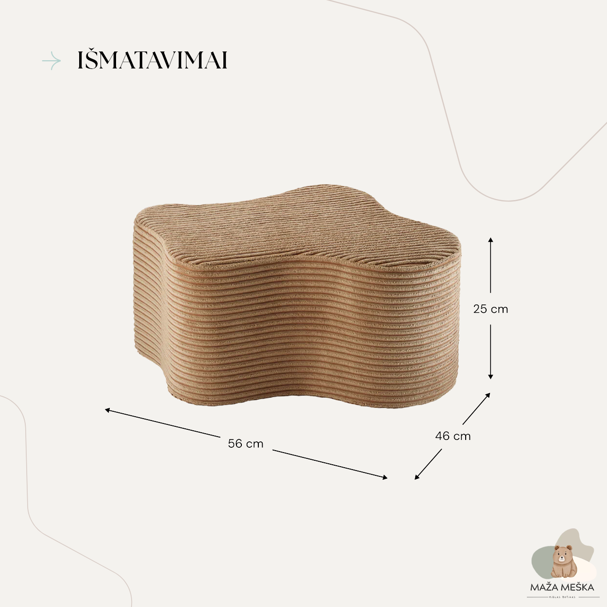 Pufas pagamintas iš minkšto, aukštos kokybės velveto (kordo), kuris ne tik suteikia prabangų pojūtį liečiant, bet ir yra atsakingas pasirinkimas. Audinys turi GRS® sertifikatą ir pagamintas iš perdirbtų PET butelių. Taip kiekvienas pufas prisideda prie tvaresnės ateities ir moko vaikus nuo mažens vertinti gamtą.