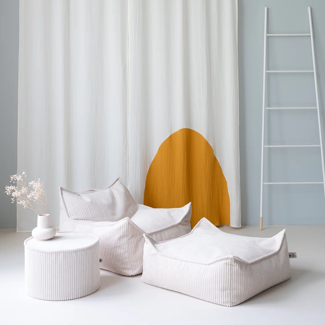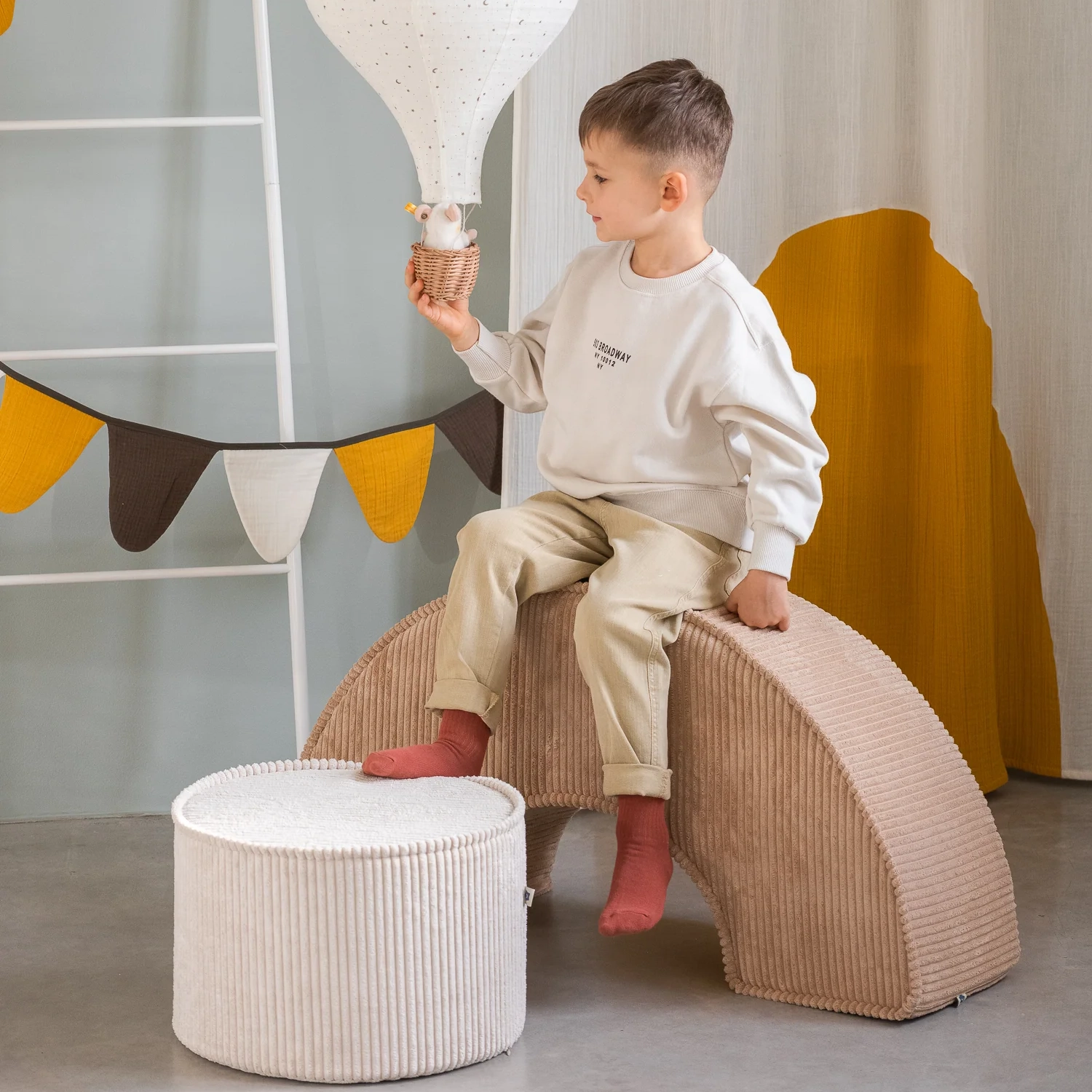 Pufas pagamintas iš aukštos kokybės, minkšto veliūrinio corduroy audinio, kuris suteikia ypatingą prisilietimo pojūtį ir tampa mėgstamiausiu mažųjų atradėjų kampeliu. Be to, audinys yra OEKO-TEX® bei GRS® sertifikuotas, pagamintas iš perdirbtų PET butelių – tai reiškia, kad renkantis šį baldą, prisidedate prie tvarios gamybos ir aplinkos tausojimo.