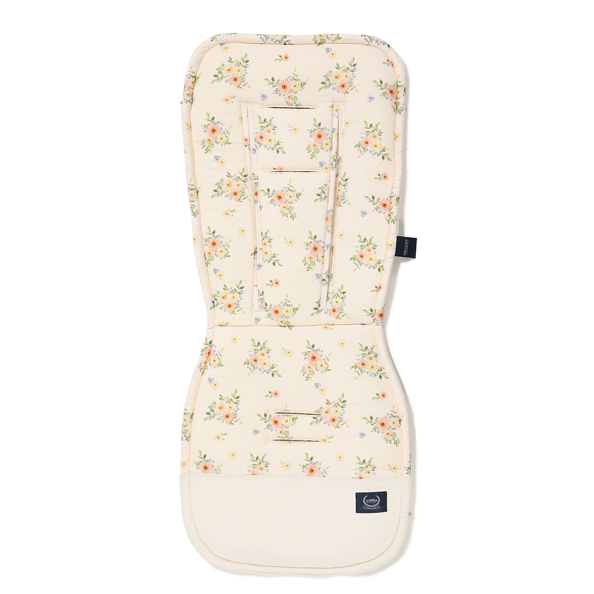 Įdėklo vidus užpildytas storu, itin atspariu ir minkštu putų sluoksniu, kuris suteikia optimalią atramą ir komfortą vaikui. Dėl storos medžiagos ir minkštos tekstūros pasivaikščiojimai bus malonūs, o mažylio kūnas nesijaus pavargęs net ilgesnių išvykų metu. Įdėklas yra dvipusis – viena pusė pagaminta iš sertifikuotos, ekologiškos medvilnės džersio, o kita pusė – elegantiškas minkštas aksomas. Ši dvipusė konstrukcija leidžia pasirinkti tinkamą medžiagą pagal oro sąlygas ar pageidaujamą stiliaus efektą.