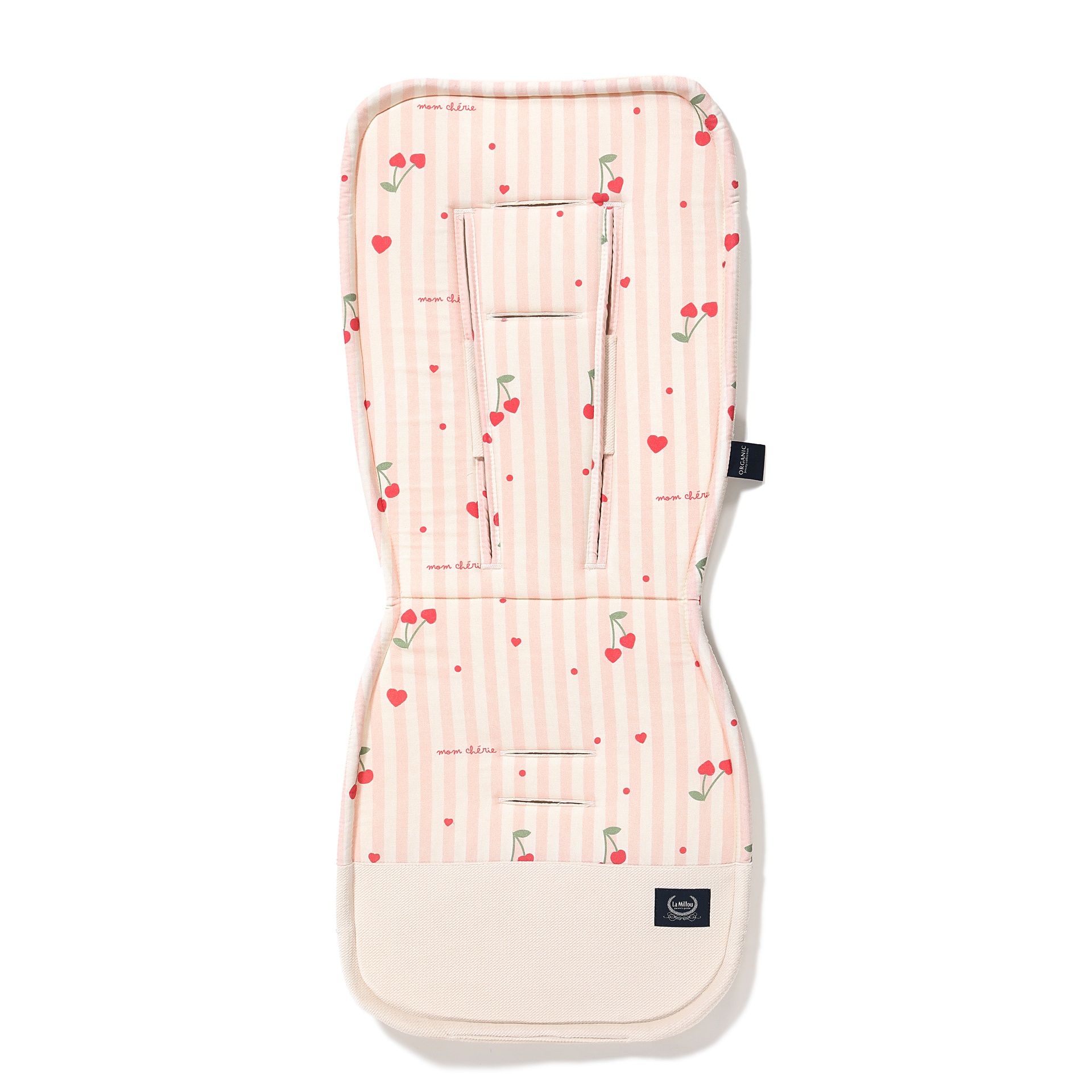 Vežimėlio Kėdutės Įdėklas Multi VYŠNIOS yra patogumo ir stiliaus sprendimas, sukurtas tėvams, kurie nori maksimaliai komfortiško ir saugaus vaiko sėdėjimo vežimėlyje. Įdėklas turi keturias angas saugos diržams ir dvi papildomas angas Angeliuko Sparnai anti-smūgio pagalvėlei pritvirtinti. Šios šešios angos leidžia įdėklui puikiai derėti su dauguma penkių taškų saugos sistemų, įskaitant vežimėlius su nedalijamais diržais. Vertikalios angos turi Velcro užsegimus be spaudimo, užtikrinančius, kad įdėklas liktų vietoje ir nepriekaištingai priglustų prie vežimėlio sėdynės.